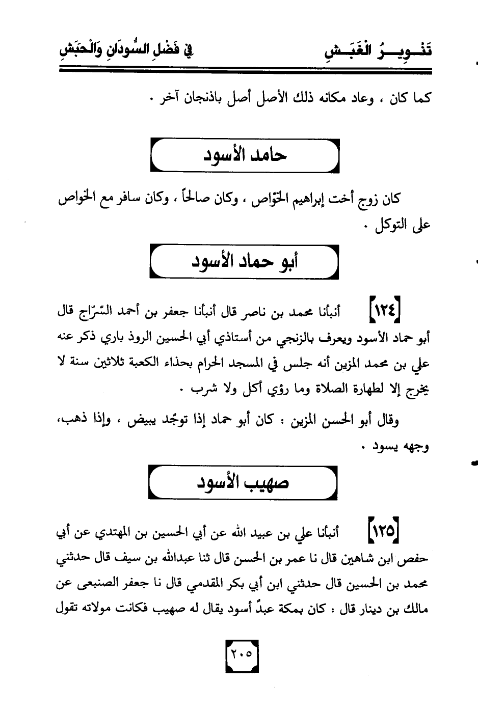 [124] أَنبأَنَا مُحَمَّد بن نَاصِر قَالَ أَنبأَنَا جَعْفَر بن أَحْمد السراج قَالَ أَبُو حَمَّاد الْأسود وَيعرف بالزنجي من أستاذي أبي الْحُسَيْن الرُّوذَبَارِي ذكر عَنهُ عَليّ بن مُحَمَّد المزين أَنه جلس فِي الْمَسْجِد الْحَرَام بحذاء الْكَعْبَة ثَلَاثِينَ سنة لَا يخرج إِلَّا لطهارة الصَّلَاة وَمَا رُؤِيَ أكل وَلَا شرب.