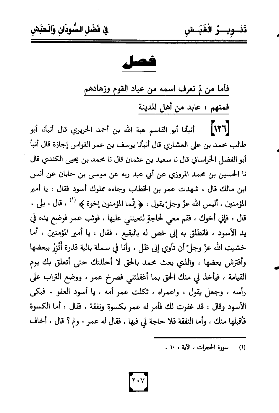 [126] أَنبأَنَا أَبُو الْقَاسِم هبة اللَّهِ بن أَحْمد الحريري قَالَ أَنبأَنَا أَبُو طَالب مُحَمَّد بن عَليّ العشاري قَالَ أَنبأَنَا يُوسُف بن عمر القواس إجَازَة قَالَ أنبأ أَبُو الْفضل الْخُرَاسَانِي قَالَ نَا سعيد بن عُثْمَان قَالَ نَا مُحَمَّد بن يحيى الْكِنْدِيّ قَالَ نَا الْحُسَيْن بن مُحَمَّد الْمروزِي عَن أبي عبد ربه عَن مُوسَى بن جَابَان عَن أنس ابْن مَالك قَالَ: شهِدت عمر بن الْخطاب وجاءه مَمْلُوك أسود فَقَالَ: يَا أَمِير الْمُؤمنِينَ، أَلَيْسَ اللَّهِ عز وَجل يَقُول: {إِنَّمَا الْمُؤْمِنُونَ إخْوَة} ، قَالَ: بلَى. قَالَ: فَإِنِّي أَخُوك، فَقُمْ معي لحَاجَة لتعينني عَلَيْهَا، فَوَثَبَ عمر فَوضع يَده فِي يَد الْأسود، فَانْطَلق بِهِ إِلَى خص لَهُ بِالبَقِيعِ، فَقَالَ: يَا أَمِير الْمُؤمنِينَ، أما خشيت اللَّهِ عز وَجل أَن تأوي إِلَى ظلّ، وَأَنا فِي سملة بالية قذرة أتزر بِبَعْضِهَا وأفترش بَعْضهَا، وَالَّذِي بعث مُحَمَّدًا بِالْحَقِّ لَا أحللتك حَتَّى أتعلق بك يَوْم الْقِيَامَة، فَيَأْخُذ لي مِنْك الْحق بِمَا أغفلتني فَصَرَخَ عمر، وَوضع التُّرَاب على رَأسه، وَجعل يَقُول: واعمراه، ثكلت عمر أمه، يَا أسود الْعَفو. فَبكى الْأسود وَقَالَ: قد غفرت لَك فَأمر لَهُ عمر بكسوة وَنَفَقَة، فَقَالَ: أما الْكسْوَة فأقبلها مِنْك، وَأما النَّفَقَة فَلَا حَاجَة لي فِيهَا، فَقَالَ لَهُ عمر: وَلم؟ قَالَ: أَخَاف