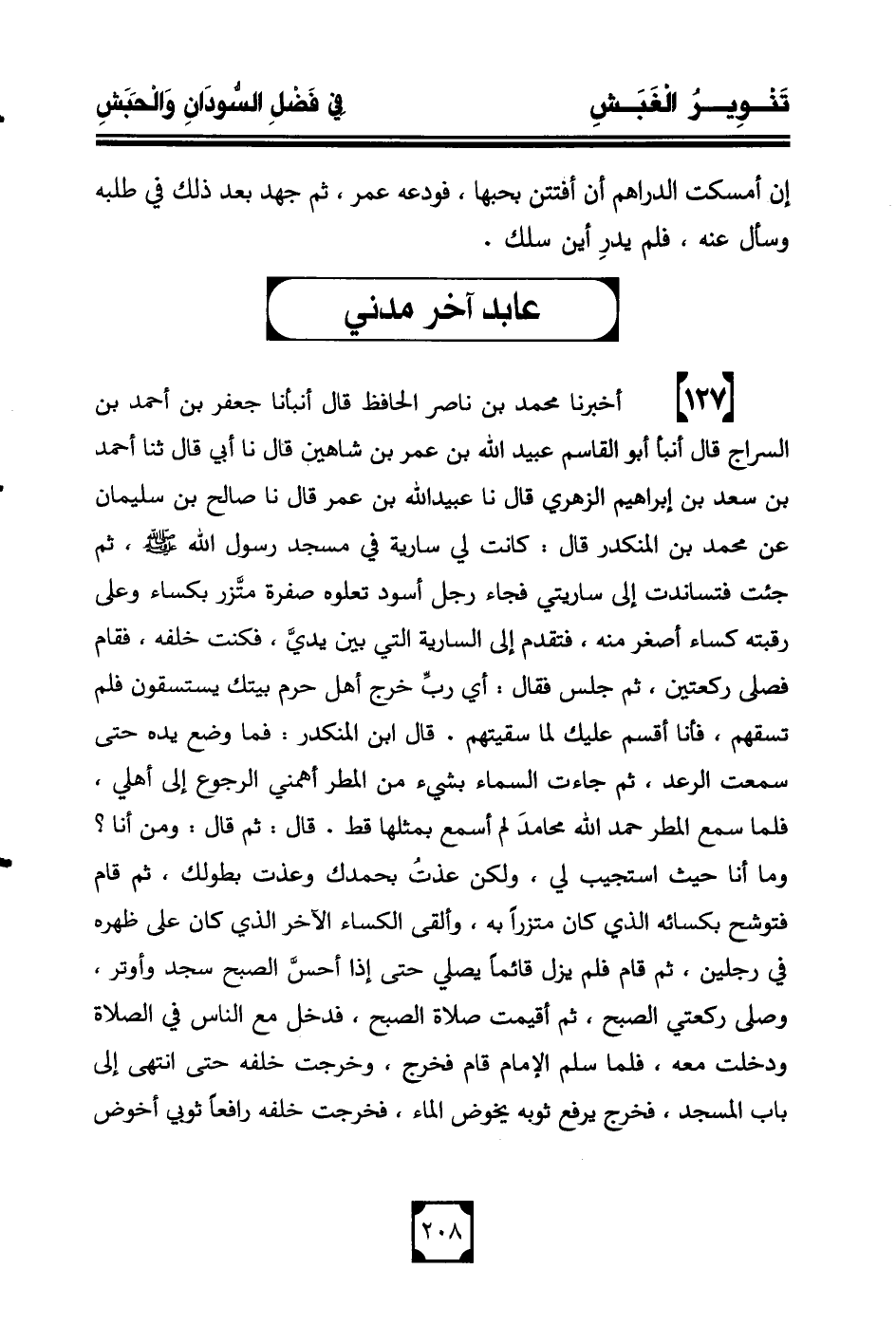 [127] أخبرنَا مُحَمَّد بن نَاصِر الْحَافِظ قَالَ أَنبأَنَا جَعْفَر بن أَحْمد بن السراج قَالَ أنبأ أَبُو الْقَاسِم عبيد اللَّهِ بن عمر بن شاهين قَالَ نَا أبي قَالَ ثَنَا أَحْمد بن سعد بن إِبْرَاهِيم الزُّهْرِيّ قَالَ نَا عبيد اللَّهِ بن عمر قَالَ نَا صَالح بن سُلَيْمَان عَن مُحَمَّد بن الْمُنْكَدر قَالَ: كَانَت لي سَارِيَة فِي مَسْجِد رَسُول اللَّهِ - صَلَّى اللَّهُ عَلَيْهِ وَسَلَّم َ -، ثمَّ جِئْت فتساندت إِلَى ساريتي فجَاء رجل أسود تعلوه صفرَة متزر بكساء وعَلى رقبته كسَاء أَصْغَر مِنْهُ، فَتقدم إِلَى السارية الَّتِي بَين يَدي. فَكنت خَلفه، فَقَامَ فصلى رَكْعَتَيْنِ، ثمَّ جلس فَقَالَ: أَي رب خرج أهل حرم بَيْتك يستسقون فَلم تسقهم، فَأَنا أقسم عَلَيْك لما سقيتهم. قَالَ ابْن الْمُنْكَدر: فَمَا وضع يَده حَتَّى سَمِعت الرَّعْد، ثمَّ جَاءَت السَّمَاء بِشَيْء من الْمَطَر أهمني الرُّجُوع إِلَى أَهلِي، فَلَمَّا سمع الْمَطَر حمد اللَّهِ محامدا لم أسمع بِمِثْلِهَا قطّ. قَالَ: ثمَّ قَالَ: وَمن أَنا؟ وَمَا أَنا حَيْثُ اسْتُجِيبَ لي، وَلَكِن عذت بحَمْدك وعذت بطولك، ثمَّ قَامَ فتوشح بكسائه الَّذِي كَانَ متزرا بِهِ، وَألقى الكساء الآخر الَّذِي كَانَ على ظَهره فِي رجلَيْهِ، ثمَّ قَامَ فَلم يزل قَائِما يُصَلِّي حَتَّى إِذا أحس الصُّبْح سجد وأوتر، وَصلى رَكْعَتي الصُّبْح، ثمَّ أُقِيمَت صَلَاة الصُّبْح، فَدخل مَعَ النَّاس فِي الصَّلَاة وَدخلت مَعَه، فَلَمَّا سلم الإِمَام قَامَ فَخرج، وَخرجت خَلفه حَتَّى انْتهى إِلَى بَاب الْمَسْجِد، فَخرج يرفع ثَوْبه يَخُوض المَاء، فَخرجت خَلفه رَافعا ثوبي أخوض