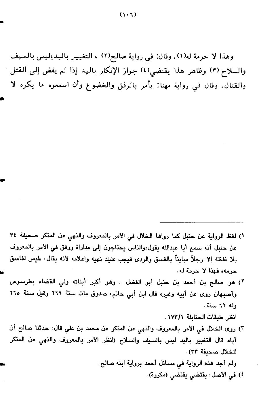 وهذا لا حرمة له. وقال: في رواية صالح، التغيير باليد؛ ليس بالسيف والسلاح وظاهر هذا يقتضي جواز الإنكار باليد إذا لم يفض إلى القتل والقتال. وقال في رواية مهنا: يأمر بالرفق والخضوع وأن اسمعوه ما يكره لا