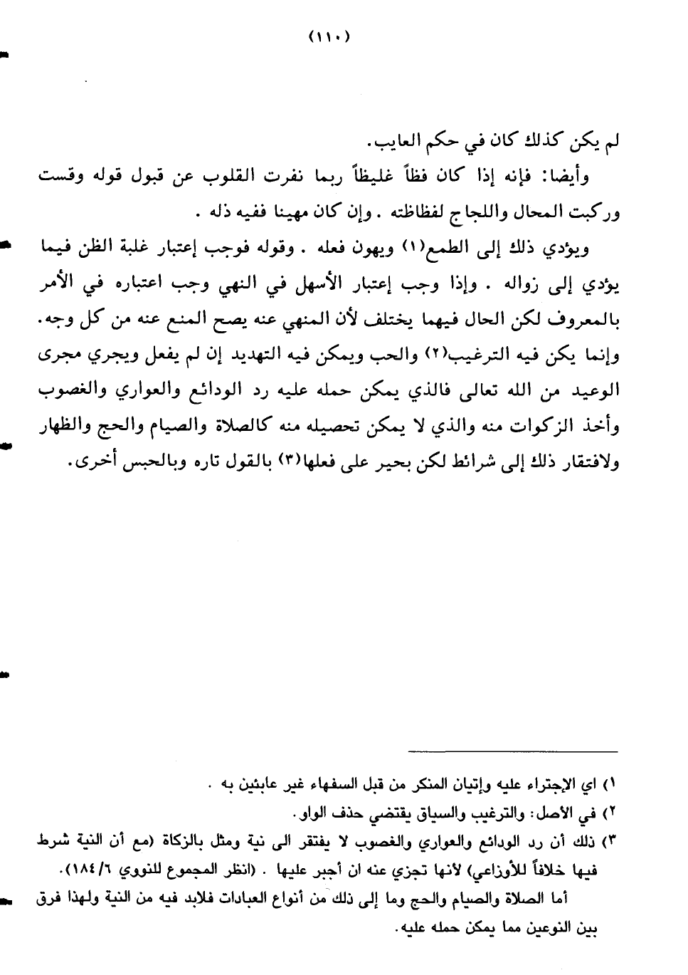 ويؤدي ذلك إلى الطمع ويهون فعله. وقوله فوجب اعتبار غلبة الظن فيما يؤدي إلى زواله. وإذا وجب اعتبار الأسهل في النهي وجب اعتباره في الأمر بالمعروف لكن الحال فيهما يختلف لأن المنهي عنه يصح المنع عنه من كل وجه. وإنما يكن فيه الترغيب والحب ويمكن فيه التهديد إن لم يفعل ويجري مجرى الوعيد من الله تعالى فالذي يمكن حمله عليه رد الودائع والعواري والغصوب وأخذ الزكوات منه والذي لا يمكن تحصيله منه كالصلاة والصيام والحج والظهار ولافتقار ذلك إلى شرائط لكن بحير على فعلها بالقول تارة وبالحبس أخرى.