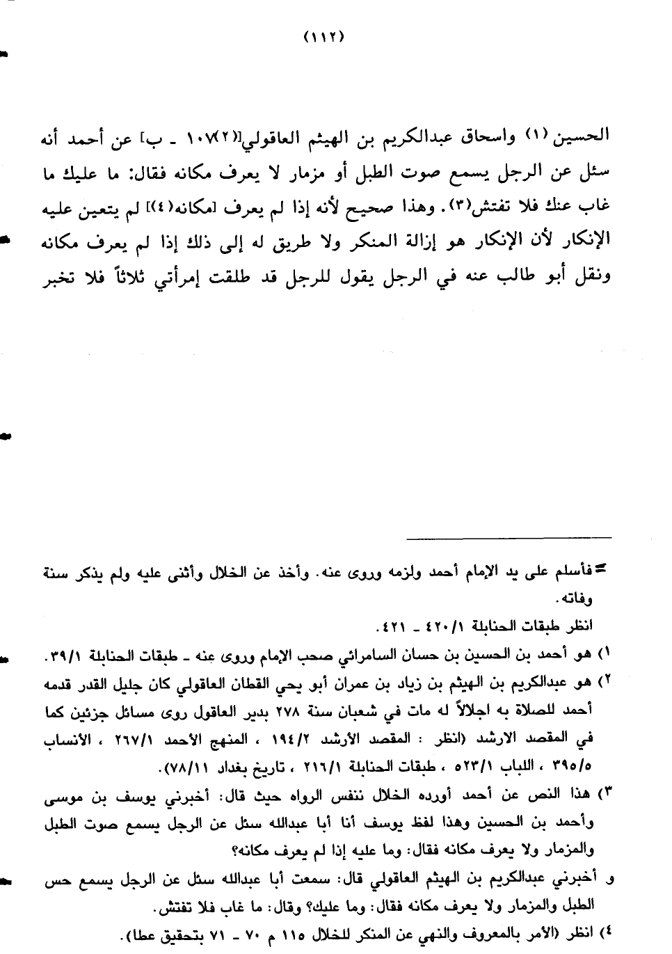 الحسين واسحاق عبد الكريم بن الهيثم العاقولي عن أحمد أنه سئل عن الرجل يسمع صوت الطبل أو مزمار لا يعرف مكانه فقال: ما عليك ما غاب عنك فلا تفتش. وهذا صحيح لأنه إذا لم يعرف [مكانه] لم يتعين عليه الإنكار لأن الإنكار هو إزالة المنكر ولا طريق له إلى ذلك إذا لم يعرف مكانه ونقل أبو طالب عنه في الرجل يقول للرجل قد طلقت امرأتي ثلاثًا فلا تخبر