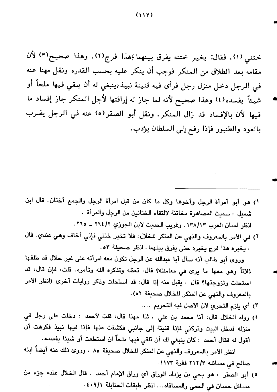 ختني. فقال: يخير ختنه يفرق بينهما، هذا فرج. وهذا صحيح لأن مقامه بعد الطلاق من المنكر فوجب أن ينكر عليه بحسب القدرة ونقل مهنا عنه في الرجل دخل منزل رجل فرأى فيه قنينة نبيذ ينبغي له أن يلقي فيها ملحًا أو شيئًا يفسده وهذا صحيح لأنه لما جاز له إراقتها لأجل المنكر جاز إفساد ما فيها لأن بالإفساد قد زال المنكر. ونقل أبو الصقر عنه في الرجل يضرب بالعود والطنبور فإذا رفع إلى السلطان يؤدب.