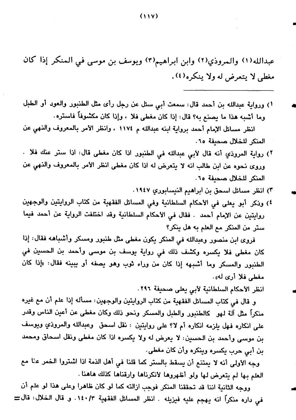عبد الله والمروذي وابن إبراهيم ويوسف بن موسى في المنكر إذا كان مغطى لا يتعرض له ولا ينكره.