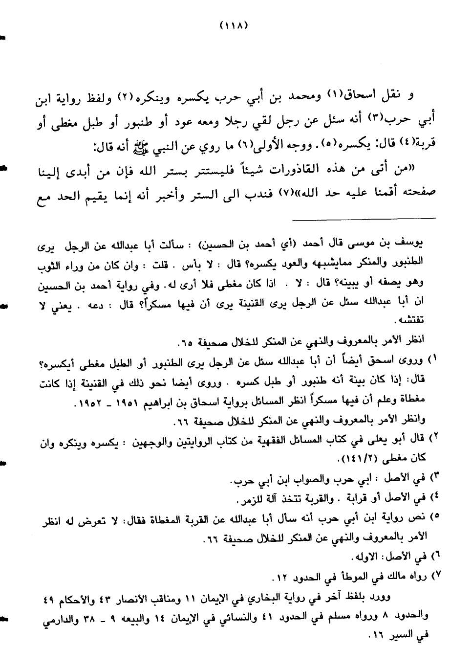 ونقل اسحاق ومحمد بن أبي حرب يكسره وينكره ولفظ رواية ابن أبي حرب أنه سئل عن رجل لقي رجلا ومعه عود أو طنبور أو طبل مغطى أو قربة قال: يكسره. ووجه الأولى ما روى عن النبي صلى الله عليه وسلم أنه قال: