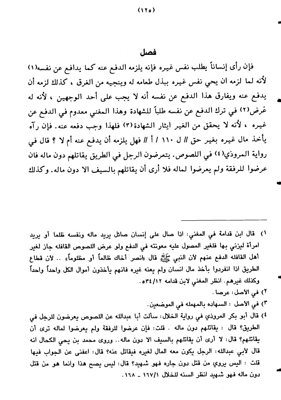 فإن رأى إنسانًا يطلب نفس غيره فإنه يلزمه الدفع عنه كما يدافع عن نفسه لأنه لما لزمه ان يحي نفس غيره ببذل طعامه له وينجيه من الغرق، كذلك لزمه أن يدفع عنه ويفارق هذا الدفع عن نفسه أنه لا يجب على أحد الوجهين، لأنه له غرض في ترك الدفع عن نفسه طلبًا للشهادة وهذا المغني معدوم في الدفع عن غيره، لأنه لا يحقق من الغير ايثار الشهادة فلهذا وجب دفعه عنه. فإن رآه يأخذ مال غيره بغير حق فهل يلزمه أن يدفع عنه أم لا؟ قال في رواية المروذي في اللصوص. يتعرضون الرجل في الطريق يقاتلهم دون ماله فإن عرضوا للرفقة ولم يعرضوا لماله فلا أرى أن يقاتلهم بالسيف إلا دون ماله. وكذلك