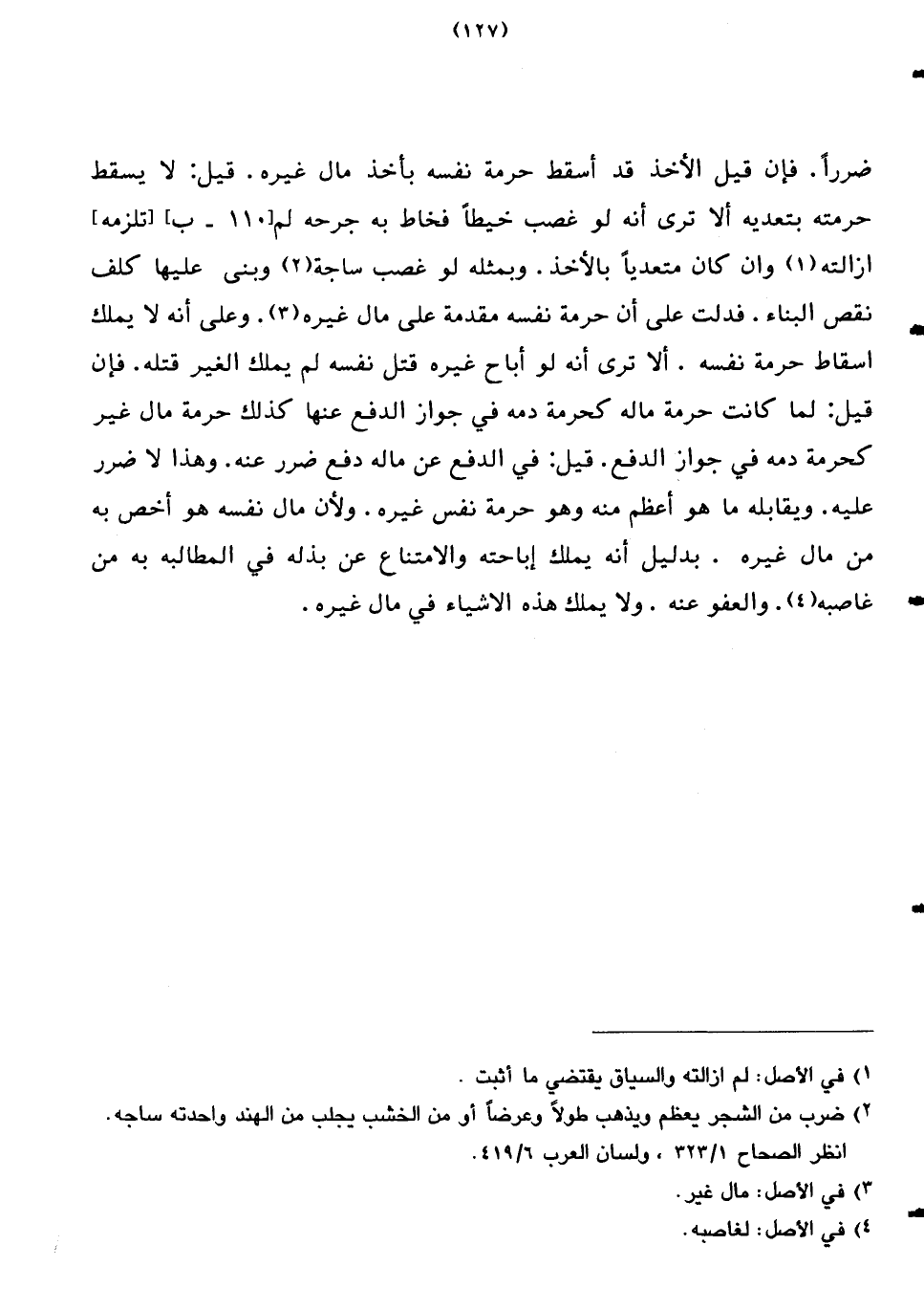 ضررًا. فإن قيل الأخذ قد أسقط حرمة نفسه بأخذ مال غيره. قيل: لا يسقط حرمته بتعديه ألا ترى أنه لو غصب خيطًا فخاط به جرحه لم [تلزمه] ازالته وان كان متعديًا بالأخذ. وبمثله لو غصب ساجة وبنى عليها كلف نقص البناء. فدلت على أن حرمة نفسه مقدمة على مال غيره. وعلى أنه لا يميك اسقاط حرمة نفسه. ألا ترى أنه لو أباح غيره قتل نفسه لم يملك الغير قتله. فإن قيل: لما كانت حرمة ماله كحرمة دمه في جواز الدفع عنها كذلك حرمة مال غير كحرمة دمه في جواز الدفع. قيل: في الدفع عن ماله دفع ضرر عنه. وهذا لا ضرر عليه. ويقابله ما هو أعظم منه وهو حرمة نفس غيره. ولأن مال نفسه هو أخص به من مال غيره. بدليل أنه يملك إباحته والامتناع عن بذله في المطالبة به من غاصبه. والعفو عنه. ولا يملك هذه الاشياء في مال غيره.