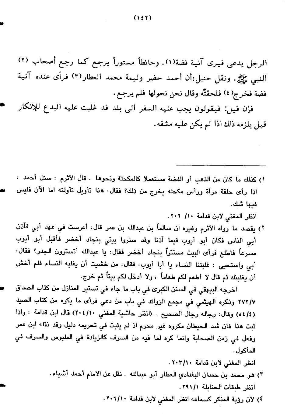 الرجل يدعى فيرى آنية فضة. وحائطًا مستورًا يرجع كما رجع أصحاب النبي صلى الله عليه وسلم. ونقل حنبل: أن أحمد حضر وليمة محمد العطار فرأى عنده آنية فضة فخرج فلحقته وقال نحن نحولها فلم يرجع.