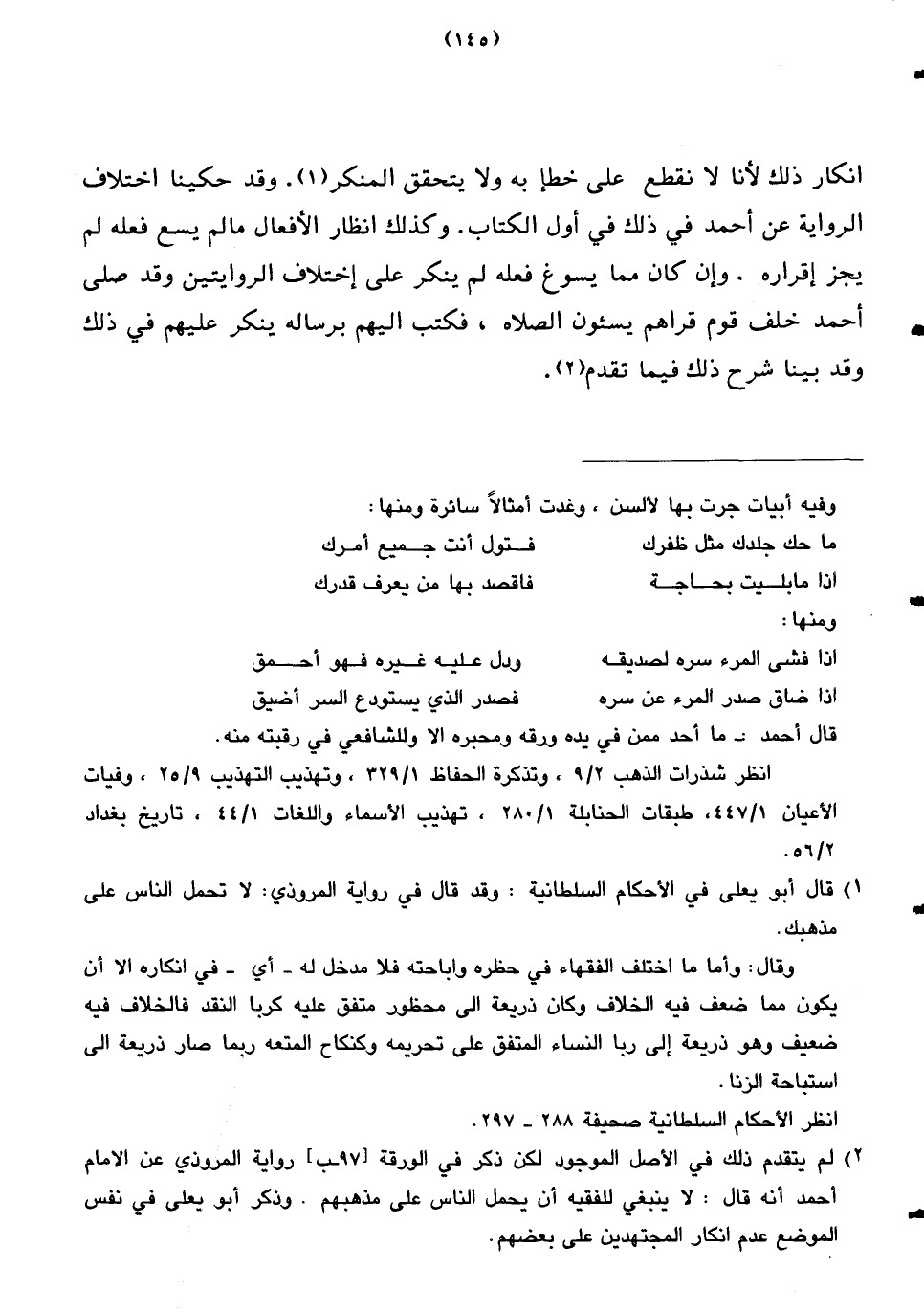 إنكار ذلك لأنا لا نقطع على خطأ به ولا يتحقق المنكر. وقد حكينا اختلاف الرواية عن أحمد في ذلك في أول الكتاب. وكذلك انظار الأفعال ما لم يسع فعله لم يجز إقراره. وإن كان مما يسوغ فعله لم ينكر على اختلاف الروايتين وقد صلى أحمد خلف قوم قراهم يسيئون الصلاة، فكتب إليهم برسالة ينكر عليهم في ذلك وقد بينا شرح ذلك فيما تقدم.