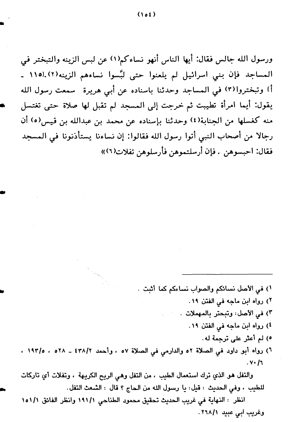 ورسول الله جالس فقال: أيها الناس أنهم نساءكم عن لبس الزينة والتبختر في المساجد فإن بني اسرائيل لم يلعنوا حتى لبسوا نساءهم الزينة وتبختروا في المساجد وحدثنا بإسناده عن أبي هريرة سمعت رسول الله يقول: أيما امرأة تطيبت ثم خرجت إلى المسجد لم تقبل لها صلاة حتى تغتسل منه كغسلها من الجنابة وحدثنا بإسناده عن محمد بن عبد الله بن قيس أن رجالا من أصحاب النبي أتوا رسول الله فقالوا: إن نساءنا يستأذنونا في المسجد فقال: احبسوهن. فإن أرسلتموهن فأرسلوهن تفلات".