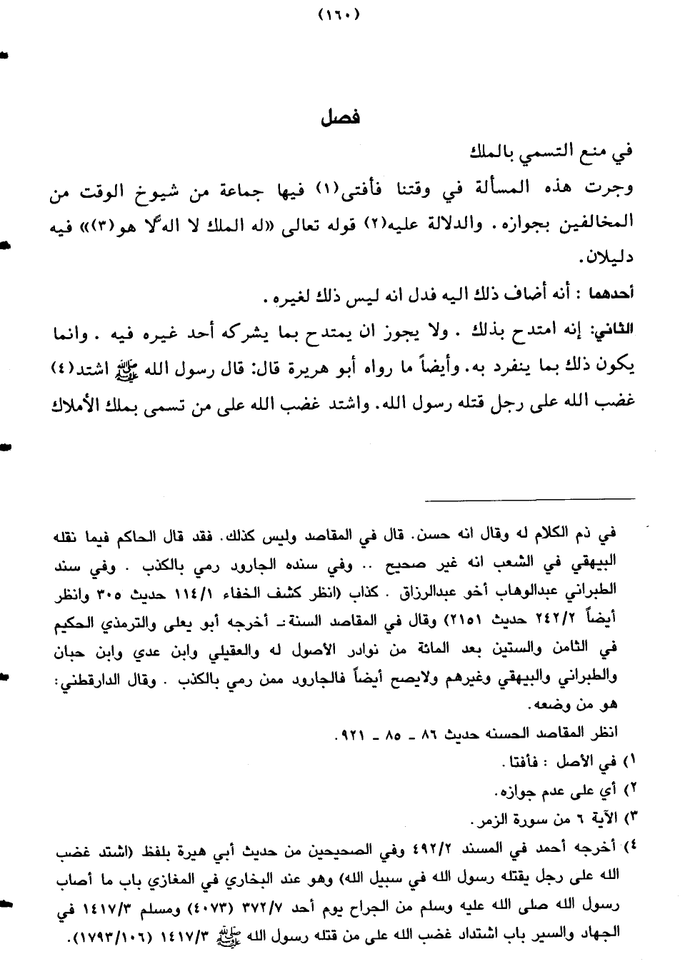 الثاني: إنه امتدح بذلك. ولا يجوز ان يمتدح بما يشركه أحد غيره فيه. وانما يكون ذلك بما ينفرد به. وأيضًا ما رواه أبو هريرة قال: قال رسول الله صلى الله عليه وسلم اشتد غضب الله على رجل قتله رسول الله. واشتد غضب الله على من تسمى بملك الأملاك