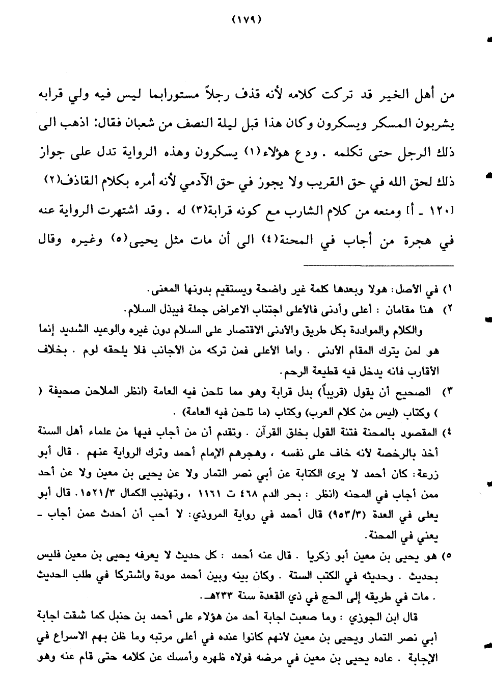 من أهل الخير قد تركت كلامه لأنه قذف رجلاً مستورا بما ليس فيه ولي قرابة يشربون المسكر ويسركون وكان هذا قبل ليلة النصف من شعبان فقال: اذهب إلى ذلك الرجل حتى تكلمه. ودع هؤلاء يسكرون وهذه الرواية تدل على جواز ذلك لحق الله في حق القريب ولا يجوز في حق الآدمي لأنه أمره بكلام القاذف ومنعه من كلام الشارب مع كونه قرابة له. وقد اشتهرت الرواية عنه في هجرة من اجاب في المحنة إلى أن مات مثل يحيى وغيره وقال