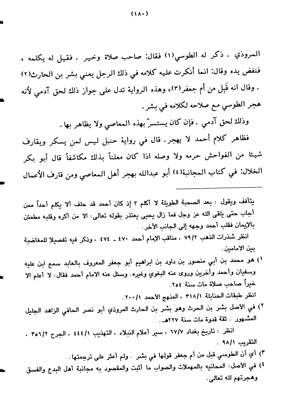 المروذي. ذكر له الطوسي فقال: صاحب صلاة وخير. فقيل له يكلمه، فنفض يده وقال: إنما أنكرت عليه كلامه في ذلك الرجل يعني بشر بن الحارث. وقال إنه قبل من أم جعفر، وهذه الرواية تدل على جواز ذلك لحق آدمي لأنه هجر الطوسي مع صلاحه لكلامه في بشر.