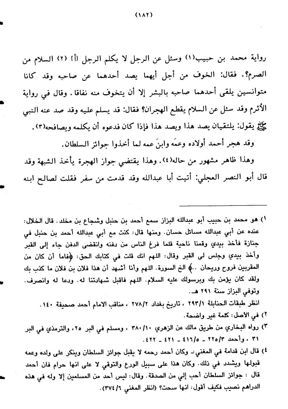 رواية محمد بن حبيب وسئل عن الرجل لا يكلم الرجل [أ] السلام من الصرام؟ . فقال: الخوف من أجل أيهما يصد أحدهما عن صاحبه وقد كانا متوانسين يلقى أحدهما صاحبه بالبشر إلا أن يتخوف منه نفاقاً. وقال في رواية الأثرم وقد سئل عن السلام يقطع الهجران؟ فقال: قد يسلم عليه وقد صد عنه النبي صلى الله عليه وسلم يقول: يلتقيان يصد هذا ويصد هذا فإذا كان فدعوه أن يكلمه ويصافحه.