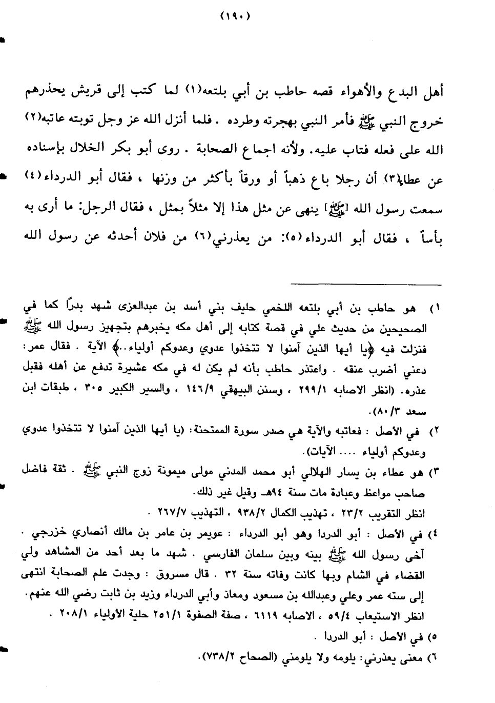 أهل البدع والأهواء قصة حاطب بن أبي بلتعة لما كتب إلى قريش يحذرهم خروج النبي صلى الله عليه وسلم فأمر النبي بهجرته وطرده. فلما أنزل الله عز وجل توبته عاتبه الله على فعله فتاب عليه. ولأنه اجماع الصحابة. روى أبو بكر الخلاب بإسناده عن عطاء أن رجلاً باع ذهباً أو ورقاً بأكثر من وزنها، فقال أبو الدرداء سمعت رسول الله [صلى الله عليه وسلم] ينهي عن مثل هذا إلا مثلاً بمثل، فقال الرجل: ما أرى به بأساً، فقال أبو الدرداء: من يعذرني من فلان أحدثه عن رسول الله