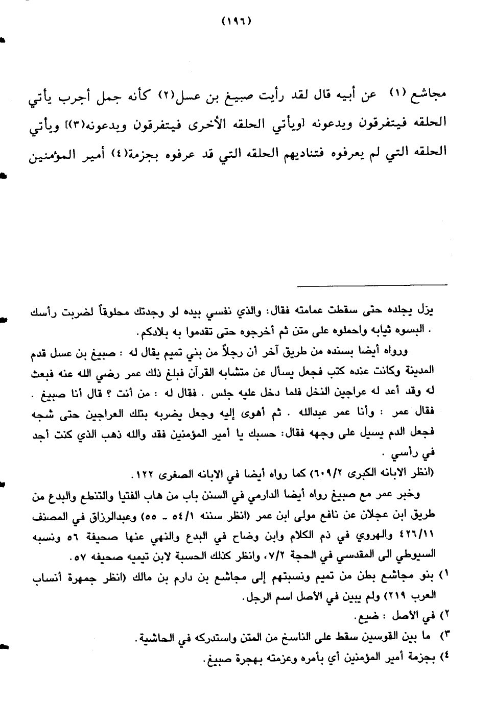 مجاشع عن أبيه قال لقد رأيت صبيغ بن عسل كأنه جمل أجرب يأتي الحلقة فيتفرقون ويدعونه ويأتي الحلقة الأخرى فيتفرقون ويدعونه ويأتي الحلقة التي لم يعرفوه فتناديهم الحلقة التي قد عرفوه بجزمة أمير المؤمنين