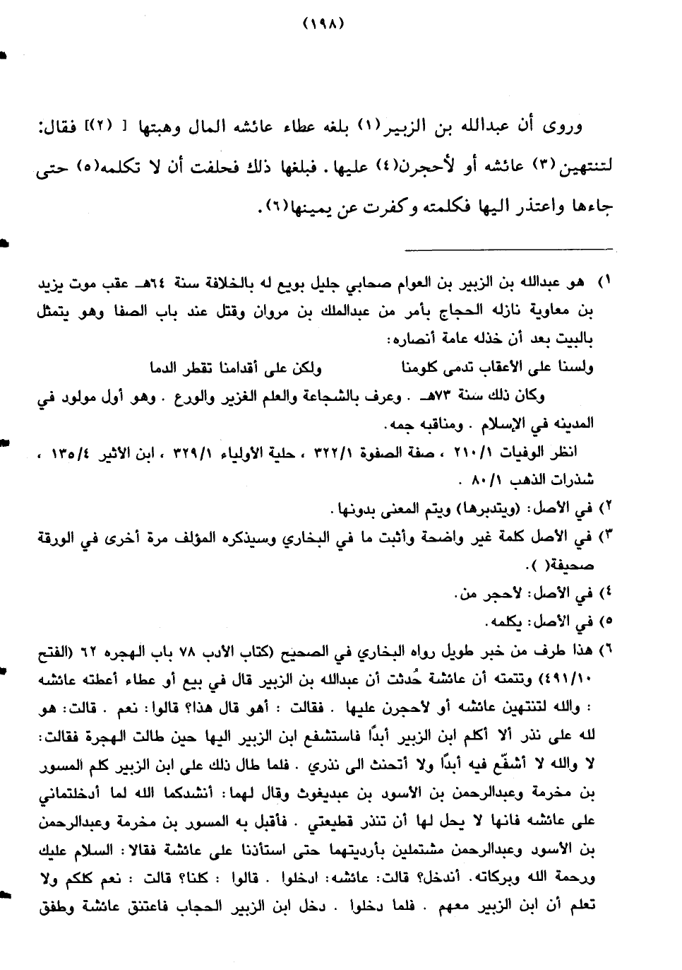 وروى أن عبد الله بن الزبير بلغه عطاء عائشة المال وهبتها فقال: لتنتهين عائشة أو لأحجرن عليها. فبلغها ذلك فحلفت أن لا تكلمه حتى جاءها واعتذر اليها فكلمته وكفرت عن يمينها.