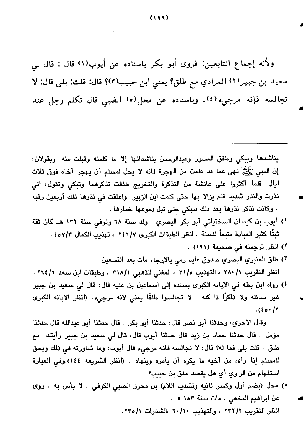 ولأنه إجماع التابعين: فروى أبو بكر بإسناده عن أيوب قال: قال لي سعيد بن جبير المرادي مع طلق؟ يعني ابن حبيب؟ قال: قل: بلى قال: لا تجالسه فإنه مرجئ. وبإسناده عن محل الضبي قال تكلم رجل عند