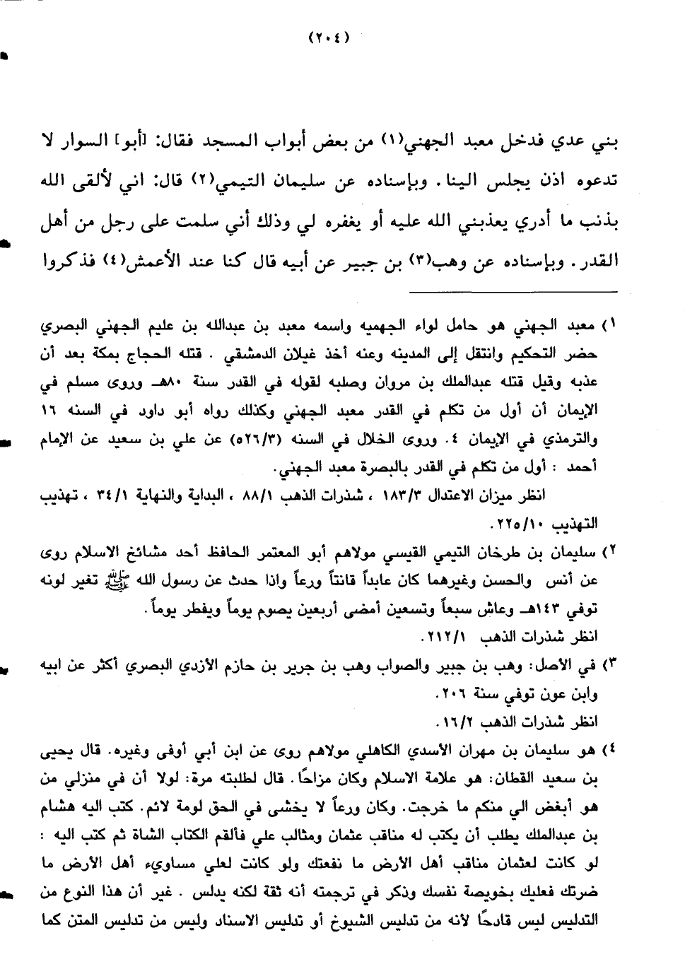 بني عدي فدخل معبد الجهني من بعض أبواب المسجد فقال: [أبو] السوار لا تدعوه اذن يجلس الينا. وبإسناده عن سليمان التيمي قال: إني لألقى الله بذنب ما أدري يعذبني الله عليه أو يغفره لي وذلك أني سلمت على رجل من أهل القدر. وبإسناده عن وهب بن جبير عن أبيه قال كنا عند الأعمش فذكروا