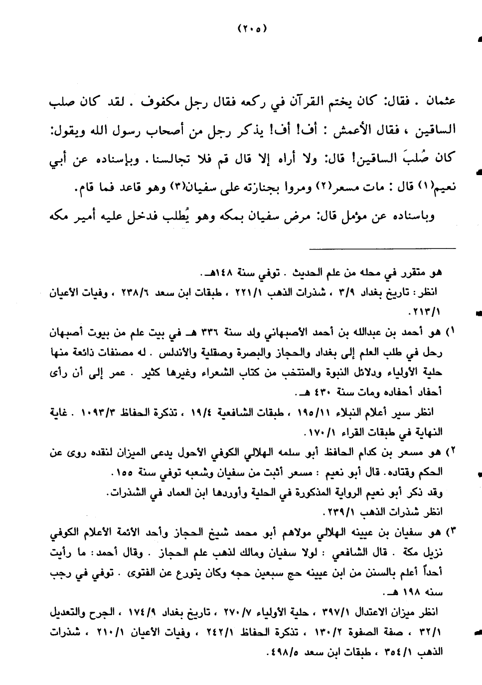 عثمان. فقال: كان يختم القرآن في ركعه فقال رجل مكفوف. لقد كان صلب الساقين، فقال الأعمش: أف! أف! يذكر رجل من أصحاب رسول الله ويقول: كان صلب الساقين! قال: ولا أراه إلا قال قم فلا تجالسنا. وبإسناده عن أبي نعيم قال: مات مسعر ومروا بجنازته على سفيان وهو قاعد فما قام. وبإسناده عن مؤمل قال: مرض سفيان بمكة وهو يطلب فدخل عليه أمير مكة