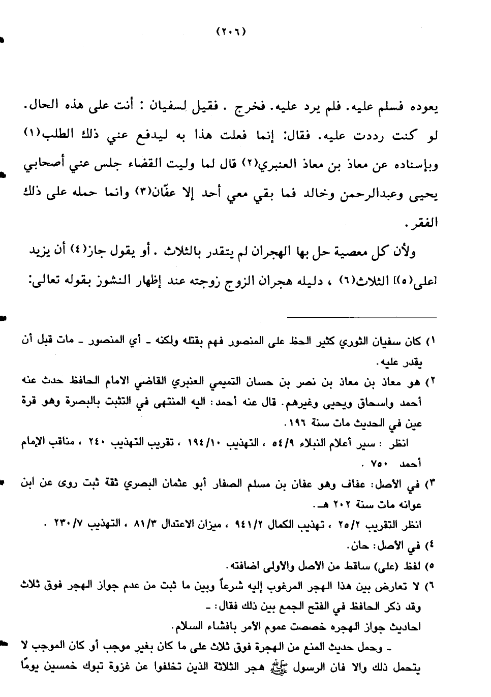 يعوده فسلم عليه. فلم يرد عليه. فخرج. فقيل لسفيان: أنت على هذه الحال. لو كنت رددت عليه. فقال: إنما فعلت هذا به ليدفع عني ذاك الطلب وبإسناده عن معاذ بن معاذ العنبري قال لما وليت القضاء جلس عني أصحابي يحيى وعبد الرحمن وخالد فما بقي معي أحد إلا عفان وإنما حمله على ذاك الفقر.
