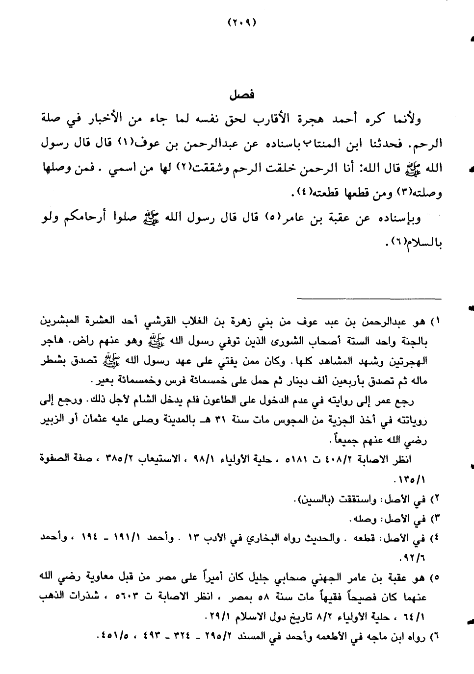 ولأنما كره أحمد هجرة الأقارب لحق نفسه لما جاء من الأخبار في صلة الرحم. فحدثنا ابن المنتاب بإسناده عن عبد الرحمن بن عوف قال قال رسول الله صلى الله عليه وسلم قال الله: أنا الرحمن خلقت الرحم وشققت لها من اسمي. فمن وصلها وصلته ومن قطعها قطعته.