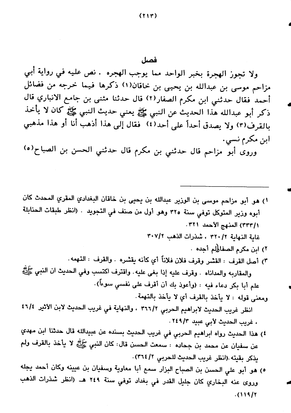 ولا تجوز الهجرة بخبر الواحد مما يوجب الهجرة. نص عليه في رواية أبي مزاحم موسى بن عبد الله بن يحيى بن خاقان ذكرها فيما خرجه من فضائل أحمد فقال حدثني ابن مكرم الصفار قال حدثنا مثنى بن جامع الانباري قال ذكر أبو عبد الله هذا الحديث عن النبي صلى الله عليه وسلم يعني حديث النبي صلى الله عليه وسلم كان لا يأخذ بالقرف ولا يصدق أحدًا على أحد فقال إلى هذا أذهب أنا أو هذا مذهبي ابن مكرم نسي.