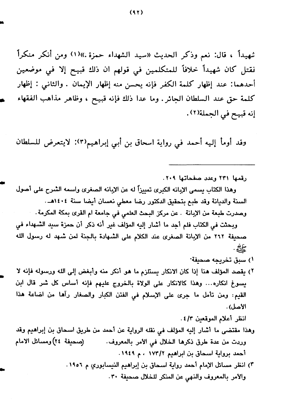 شهيداً، قال: نعم وذكر الحديث "سيد الشهداء حمزة." ومن أنكر منكراً نقتل كان شهيداً خلافاً للمتكلمين في قولهم ان ذلك قبيح إلا في موضعين أحدهما: عند إظهار كلمة الكفر فإنه يحسن منه إظهار الإيمان، والثاني: إظهار كلمة حق عند السلطان الجائر. وما عدا ذلك فإنه قبيح، وظاهر مذاهب الفقهاء إنه قبيح في الجملة.