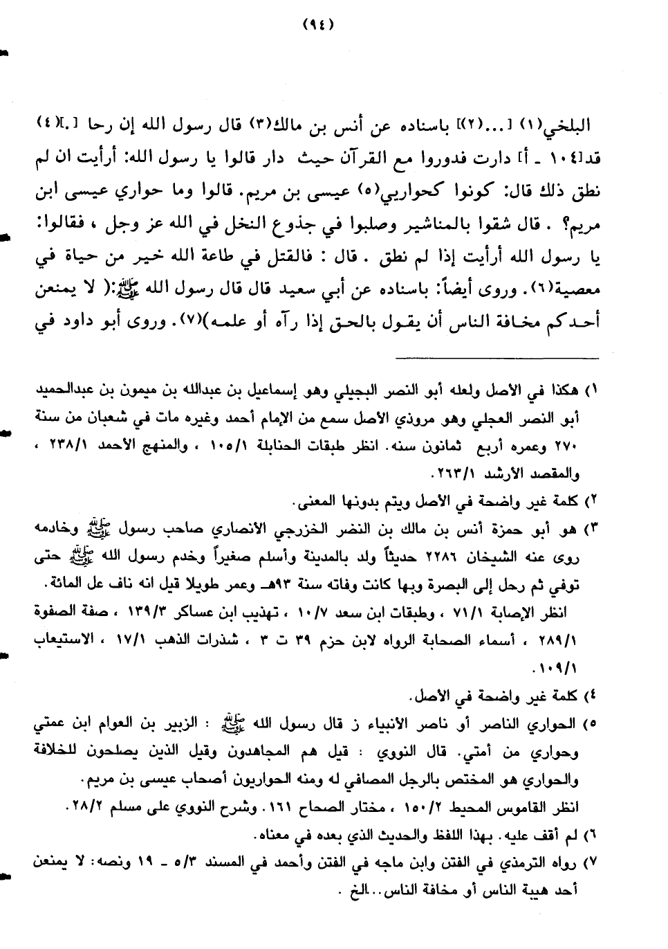 البلخي بإسناده عن أنس بن مالك قال رسول الله إن رحا قد دارت فدوروا مع القرآن حيث دار قالوا يا رسول الله: أرأيت ان لم نطق ذلك قال: كونوا كحواريي عيسى بن مريم. قالوا وما حواري عيسى ابن مريم؟ ، قال شقوا بالمناشير وصلبوا في جذوع النخل في الله عز وجل، فقالوا: يا رسول الله أرأيت إذا لم نطق. قال: فالقتل في طاعة الله خير من حياة في معصية. وروى أيضاً: بإسناده عن أبي سعيد قال قال رسول الله صلى الله عليه وسلم: (لا يمنعن أحدكم مخافة الناس أن يقول بالحق إذا رآه أو علمه). وروى أبو داود في