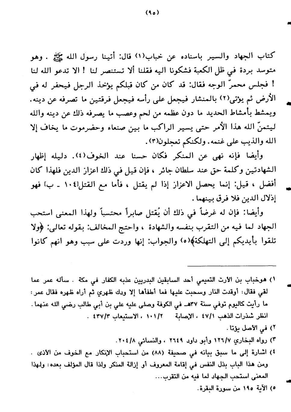كتاب الجهاد والسير بإسناده عن خباب قال: أتينا رسول الله صلى الله عليه وسلم. وهو متوسد بردة في ظل الكعبة فشكونا اليه فقلنا ألا تستنصر لنا! الا تدعو الله لنا! فجلس محمر الوجه فقال: قد كان من كان قبلكم يؤخذ الرجل فيحفر له في الأرض ثم يؤتى بالمنشار فيجعل على رأسه فيجعل فرقتين ما تصرفه عن دينه. ويمشط بأمشاط الحديد ما دون عظمه من لحم وعصب ما يصرفه ذلك عن دينه والله ليتمن الله هذا الأمر حتى يسير الراكب ما بين صنعاء وحضر موت ما يخاف إلا الله والذيب على غنمه. ولكنكم تعجلون.