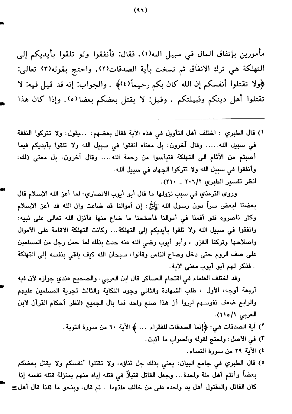مأمورين بإنفاق المال في سبيل الله. فقال: فأنفقوا ولو تلقوا بأيديكم إلى التهلكة هي ترك الانفاق ثم نسخت بأية الصدقات. واحتج بقوله تعالى: {ولا تقتلوا أنفسكم إن الله كان بكم رحيمًا} والجواب: إنه قد قيل فيه: لا تقتلوا أهل دينكم وقبيلتكم. وقيل: لا يقتل بعضكم بعضا. وإذا كان هذا
