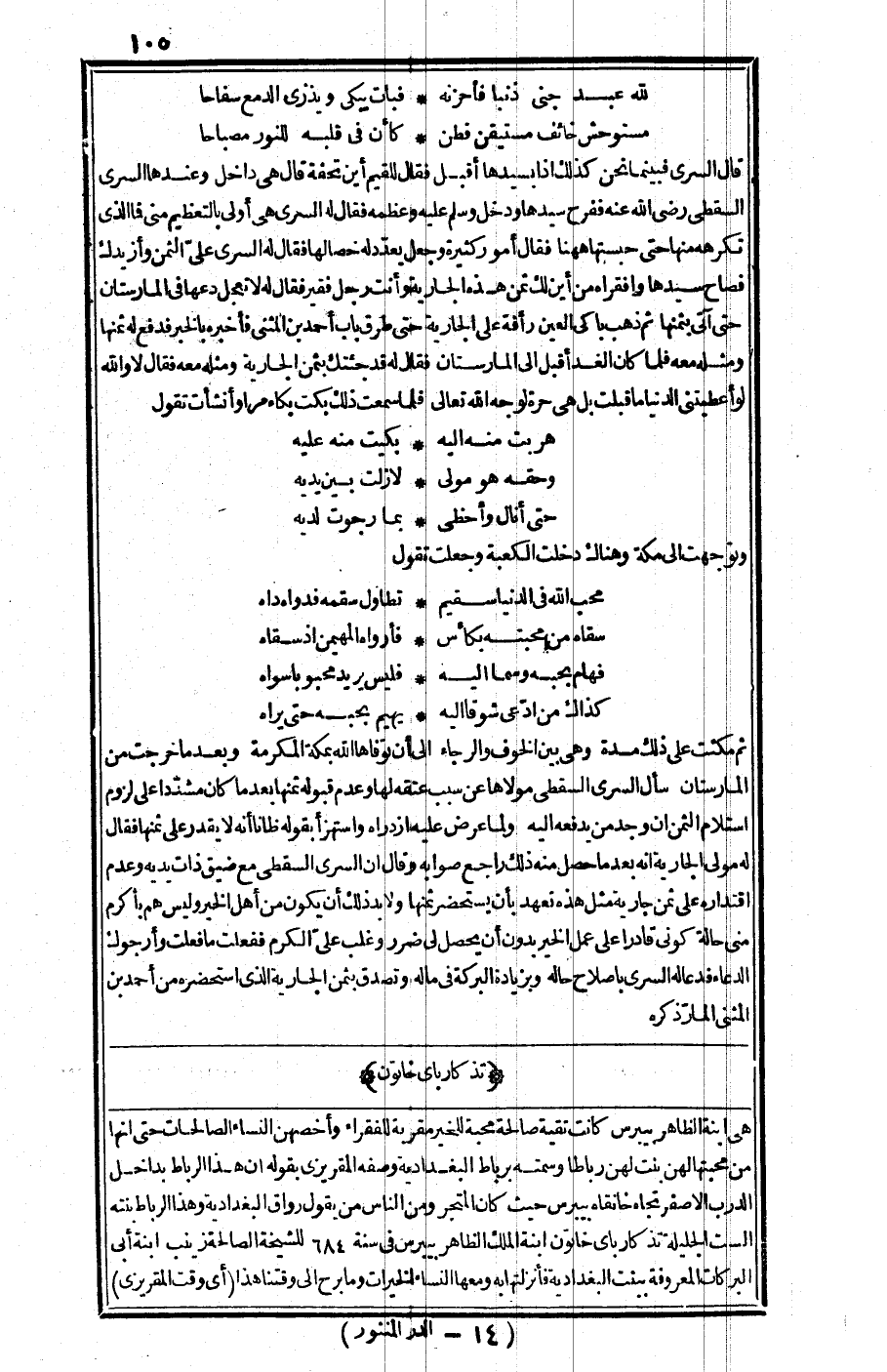 قال السري: فبينما نحن كذلك إذا بسيدها أقبل فقال للقيم: أين تحفة؟ قال: هي في الداخل، وعندها السري السقطي -رضي الله عنه- ففرح سيدها ودخل وسلم عليه وعظمه فقال له السري: هي أولى بالتعظيم مني فما الذي تكرهه منها حتى حبستها ههنا؟ فقال: أمور كثيرة، وجعل يعدد له خصالها فقال له السري: علي الثمن وأزيدك فصاح سيدها وا فقراه! من أين لك ثمن هذه الجارية وأنت رجل فقير؟ فقال له: لا تعجل دعها في المارستان حتى آتي بثمنها، ثم ذهب باكي العين رأفة على الجارية حتى طرق باب أحمد بن المثنى فأخبره بالخبر، فدفع له ثمنها ومثله معه، فلما كان الغد أقبل إلى المارستان فقال له: قد جئتك بثمن الجارية ومثله معه فقال: لا والله لو أعطيتني الدنيا ما قبلت بل هي حرة لوجه الله تعالى فلما سمعت ذلك بكيت بكاء مرا وأنشأت تقول: