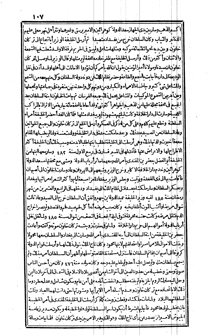 وقال الوزير لما وصل ل "تركان خاتون": إن سيدنا ومولانا أمير المؤمنين يقول: إن الله يأمركم أن تؤدوا الأمانات إلى أهلها وقد أذن في نقل الوديعة إلى داره، فأجابت بالسمع والطاعة، وحضر نظام الملك فمن دونه دولة السلطان، وكل منهم معه من الشمع والمشاعل شيء كثير، وجاء نساء الأمراء والكبار ومن دونهم كل واحدة منهن منفردة في جماعتها وتجملها وبين أيديهن الشموع الموكبات والمشاعل يحمل ذلك جميعه الفرسان، ثم جاءت الخاتون ابنة السلطان بعد الجميع في محفة مجللة عليها من الذهب والجواهر أكثر شيء وقد أحاط بالمحفة مائة جارية من الأتراك بالمراكب العجيبة، وسارت إلى دار الخلافة وكانت ليلتهم مشهودة لم ير ببغداد مثلها، فلما كان الغد أحضر الخليفة أمراء السلطنة وخلع عليهم كلهم وعلى كل من له ذكر في العسكر وأرسل الخلع مدة في دار الخليفة وولدت منه ولدا لم يطب لها المقام معه فأخبرت والدتها بذلك وهي أرسلت إلى الخليفة تطلب ابنتها طلبا لا بد منه، وسبب ذلك أن الخليفة أكثر الاطراح لها والإعراض عنها، فأذن لها في المسير، فسارت في ربيع الأول سنة 482 هـ وسار معها ابنها من الخليفة أبو الفضل جعفر بن المقتدي بأمر الله ومعها سائر أرباب الدولة، ومشى مع محفتها سعد الدولة "كوهرائين" وخدم دار الخلافة الأكابر، وخرج الوزير وشيعهم إلى النهروان وعاد وسارت الخاتون إلى أصبهان فأقامت بها إلى ذي القعدة، وتوفيت، وجلس الوزير ببغداد للعزاء سبعة أيام وأكثر الشعراء مراثيها ببغداد وبعسكر السلطان.