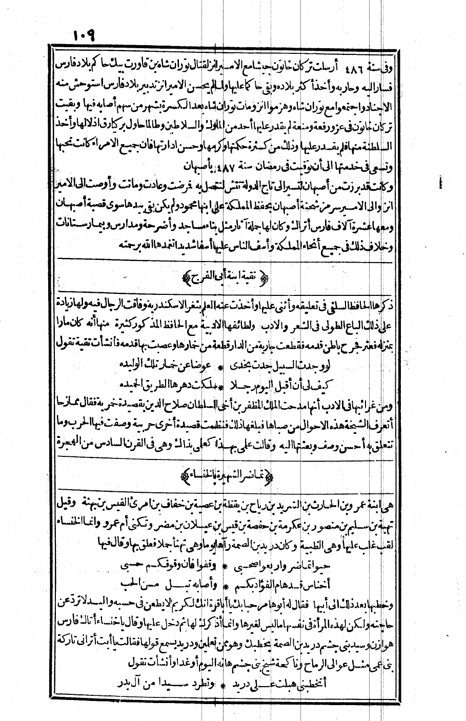 ذكرها الحافظ السلفي في تعليقه وأثنى عليها وأخذت عنه العلم بثغر الإسكندرية وفاقت الرجال فيه ولها زيادة على ذلك الباع الطولى في الشعر والأدب ولطائفها الأدبية مع الحافظ المذكور كثيرة منها أنه كان مارا بمنزله، فعثر فجرح قدمه فقطعت جارية من الدار قطعة من خمارها وعصبت بها قدمه فأنشأت تقية تقول: