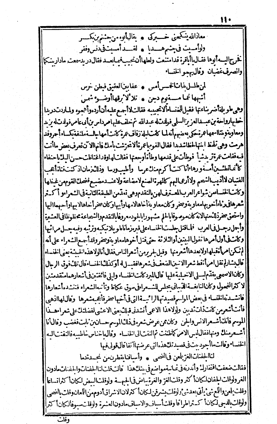 قال المبرد: كانت الخنساء وليلى فائقتين في أشعارهما متقدمتين لأكثر الفحول، وكان النابغة الذبياني يجلس للشعراء في سوق عكاظ وتأتيه الشعراء فتنشده أشعارها فأنشدته الخنساء في بعض المواسم قصيدتها الرائية التي في أخيها صخر، فأعجبه شعرها وقال له: اذهبي فأنت أشعر من كانت ذات ثديين، ولولا هذا الأعمى أنشدني قبلك -يعني الأعشى- لفضلتك على شعراء هذا الموسم فإنك أشعر الإنس والجن وكان ممن عرض شعره في ذلك الموسم حسان بن ثابت فغضب وقال: أنا أشعر منك ومنها. فقال: ليس الأمر كما ظننت، ثم التفت إلى الخنساء. وقال: ياخناس خاطبيه، فالتفتت إليه الخنساء وقالت: ما أجود بيت في قصيدتك هذه التي عرضتها آنفا؟ قال قولي فيها: