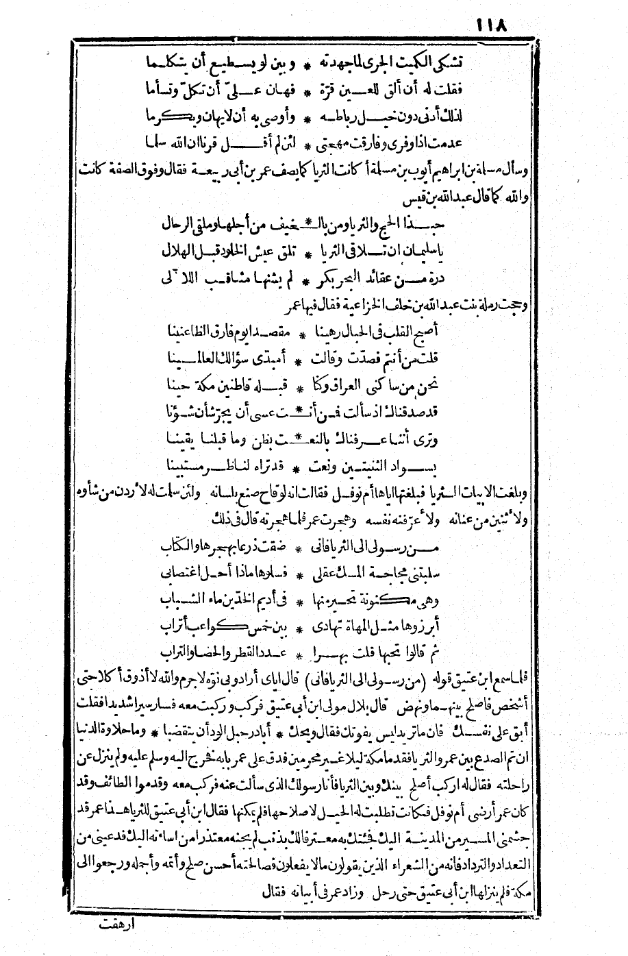 فلما سمع ابن عتيق قوله: " من رسولي إلى الثريا فإني" قال: إياي أراد وبي نوه، لا جرم والله لا أذوق أكلا حتى أشخص فأصلح بينهما ونهض. قال بلال مولى ابن أبي عتيق: فركب وركبت معه فسار سيرا شديدا فقلت: أبق على نفسك فإن ما تريد ليس يفوتك. فقال: ويحك.