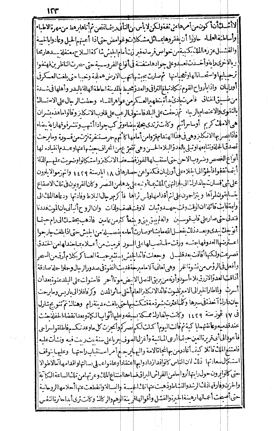 ثم صارت بجيشها تنهب الأرض هملجة وخبباً حتى بلغت العسكر في "أورليان" وإذا بأرواح القوم تكاد تبلغ التراقي والعدو محيط بالمدينة إحاطة الهالة بالبدر وأهلها في شدة من ضيق الخناق، فأمرت بادئ بدأة بتطهير العسكر من عواهر النساء، وحضت الرجال على الاستمساك بالتقوى والاعتصام بالرجاء، ثم زحفت على البلد، فاستول ىالرعب على قلوب الإنكليز وقالوا: ما هذه بشر إن هي إلا ملك كريم، أو ساحر أثيم، وكانت ترتدي بحلة بيضاء وتركب جواداً أشهب وتنشر فوقها راية بيضاء فإذا بصر بها الإنكليز وهي في هذا الهندام فروا من أمامها كأنهم حمر مستنفرة فرت من قسورة.