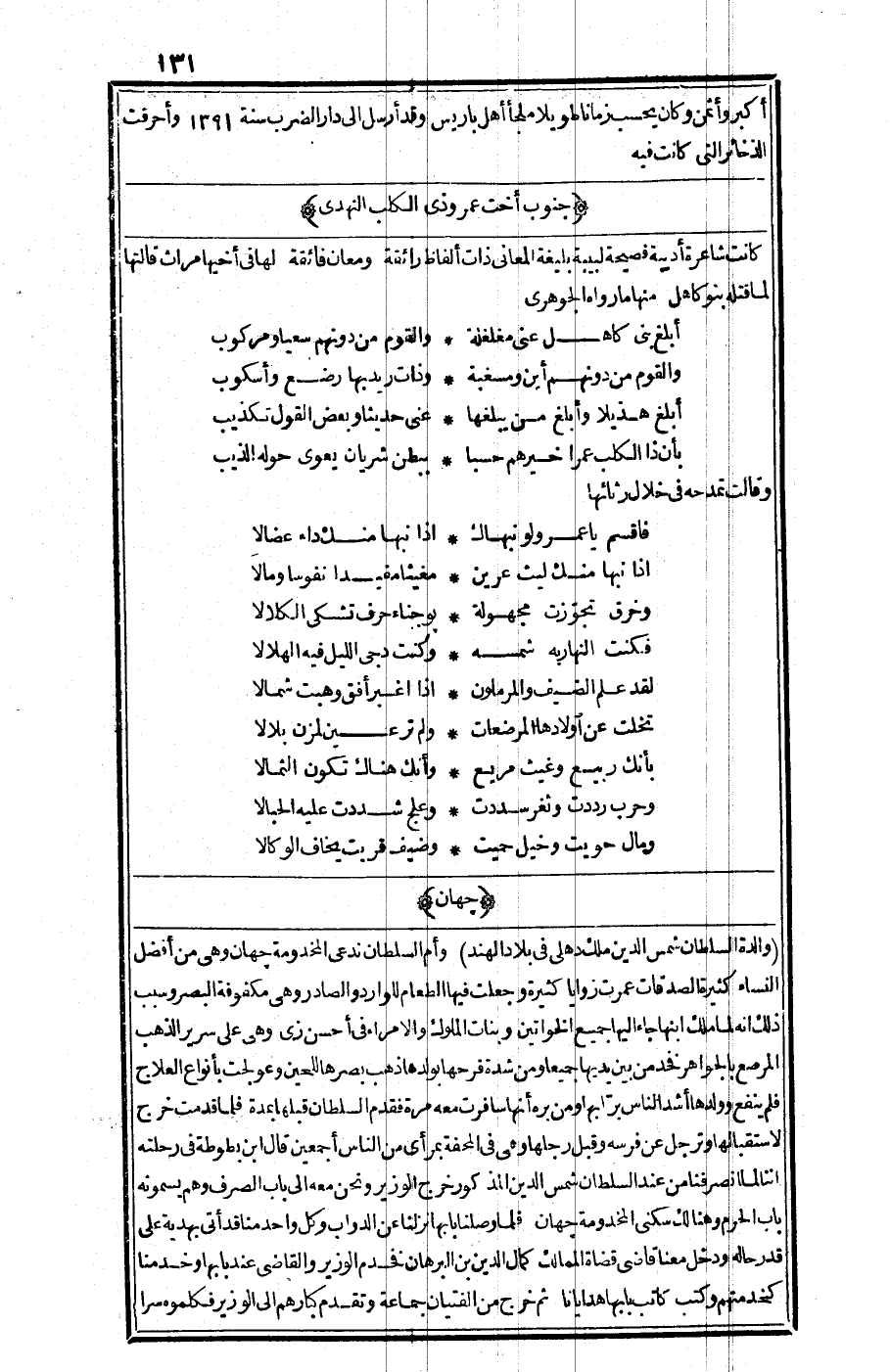 قال ابن بطوطة في "رحلته": "إننا لما انصرفنا من عند السلطان شمس الدين المذكور خرج الوزير ونحن معه على باب الصرف وهم يسمونه باب الحرم، وهنالك سكنى المخدوعة "جهان"، فلما وصلنا بابها نزلنا عن الدواب وكل واحد منا قد أتى بهدية على قدر حاله ودخل معنا قاضي قضاة الممالك، كمال الدين بن البرهان فخدم الوزير والقاضي عند بابها وخدمنا كخدمتهم، وكتب بابها هدايانا، ثم خرج من الفتيان جماعة وتقدم كبارهم على الوزير فكلموه سرا