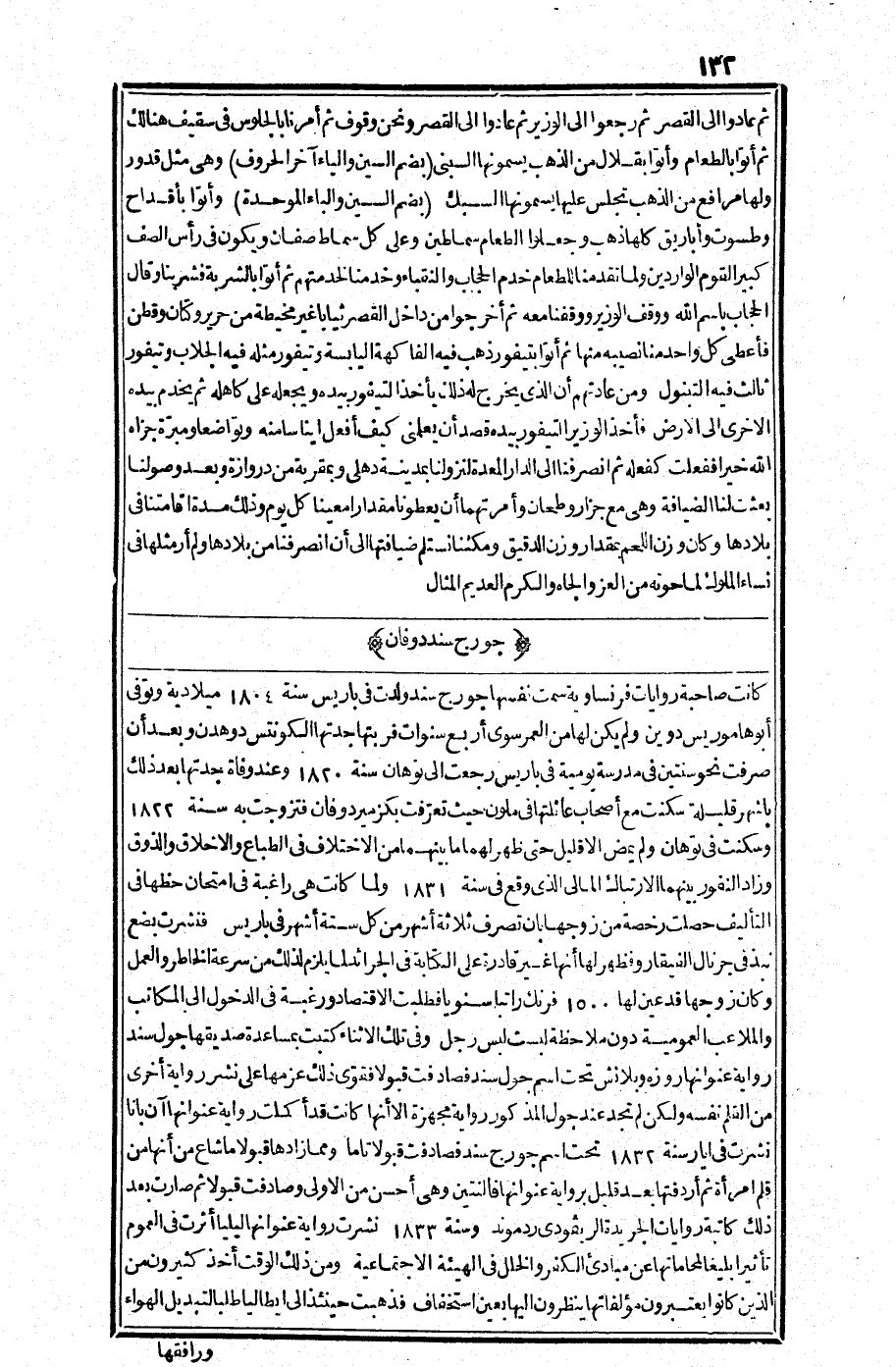 كانت صاحبة روايات فرنساوية، سمت نفسها "جورج سند" ولدت في باريس سنة 1804 ميلادية، وتوفي أبوها "موريس دوين" ولم يكن لها من العمر سوى أربع سنوات فربتها جدتها الكونتس "دوهدن"، وبعد أن صرفت نحو سنتين في مدرسة يومية في باريس رجعت إلى "توهان" سنة 1820م. وعند وفاة جدتها بعد ذلك بأشهر قليلة سكنت مع أصحاب عائلتها في "ملون" حيث تعرفت ب "كزمير دوفان" فتزوجت به سنة 1822م وسكنت في "توهان" ولم يمض إلا قليل حتى ظهر لهما ما بينهما من الاختلاف في الطباع والأخلاق والذوق وزاد النفور بينهما الارتباك المالي الذي وقع في سنة 1831م. ولما كانت هي راغبة في امتحان حظها في التأليف حصلت رخصة من زوجها بأن تصرف ثلاثة أشهر من كل ستة أشهر في باريس، فنشرت بضع نبذ في جرنال "الفيقارو" فظهر لها أنها غير قادرة على الكتابة في الجرائد لما يلزم لذلك من سرعة الخاطر والعمل، وكان زوجها قد عين لها 1500 فرنك سنويا، فطلبت الاقتصاد، ورغبة في الدخول على المكاتب والملاعب العمومية دون ملاحظة لبست لبس رجل.