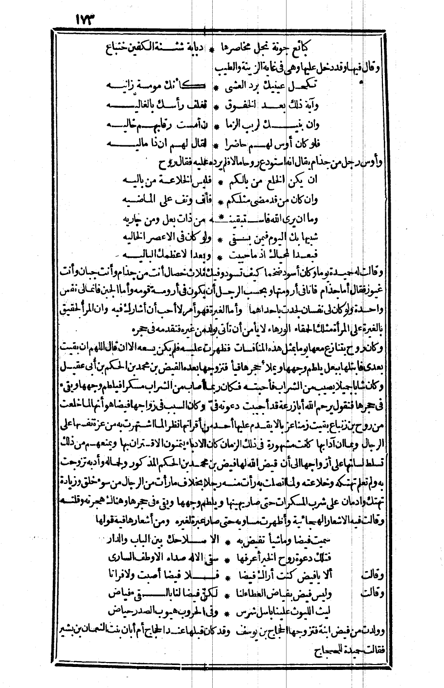 وكان السبب في زواجها فيضا هو أنها لما خلعت من روح بن زنباع بقيت زمنا عزبا لا يقدم عليها أحد من أقرانها نظرا لما اشتهرت به من عزة نفسها على الرجال، وبما أن آدابها كانت مشهورة في ذلك الزمان كان الأدباء يتمنون الاقتران بها ويمنعهم من ذلك تسلط لسانها على أزواجها إلى أن قيض الله لها فيض بن محمد الحكم المذكور ولجماله وأدبه تزوجت به، ولم تعلم تهتكه وخلاعته، ولما اتصلت به رأت منه رجلا بخلاف ما رأت من الرجال من سوء خلق وزيادة تهتك وإدمان على شرب المسكرات حتى صار يهينها ويلطم وجهها ويقيء في حجرها، وهناك هجرته وقلته وقالت فيه الأشعار الهجائية وأظهرت مساويه حتى صار عبرة لغيره. ومن أشعارها فيه قولها: