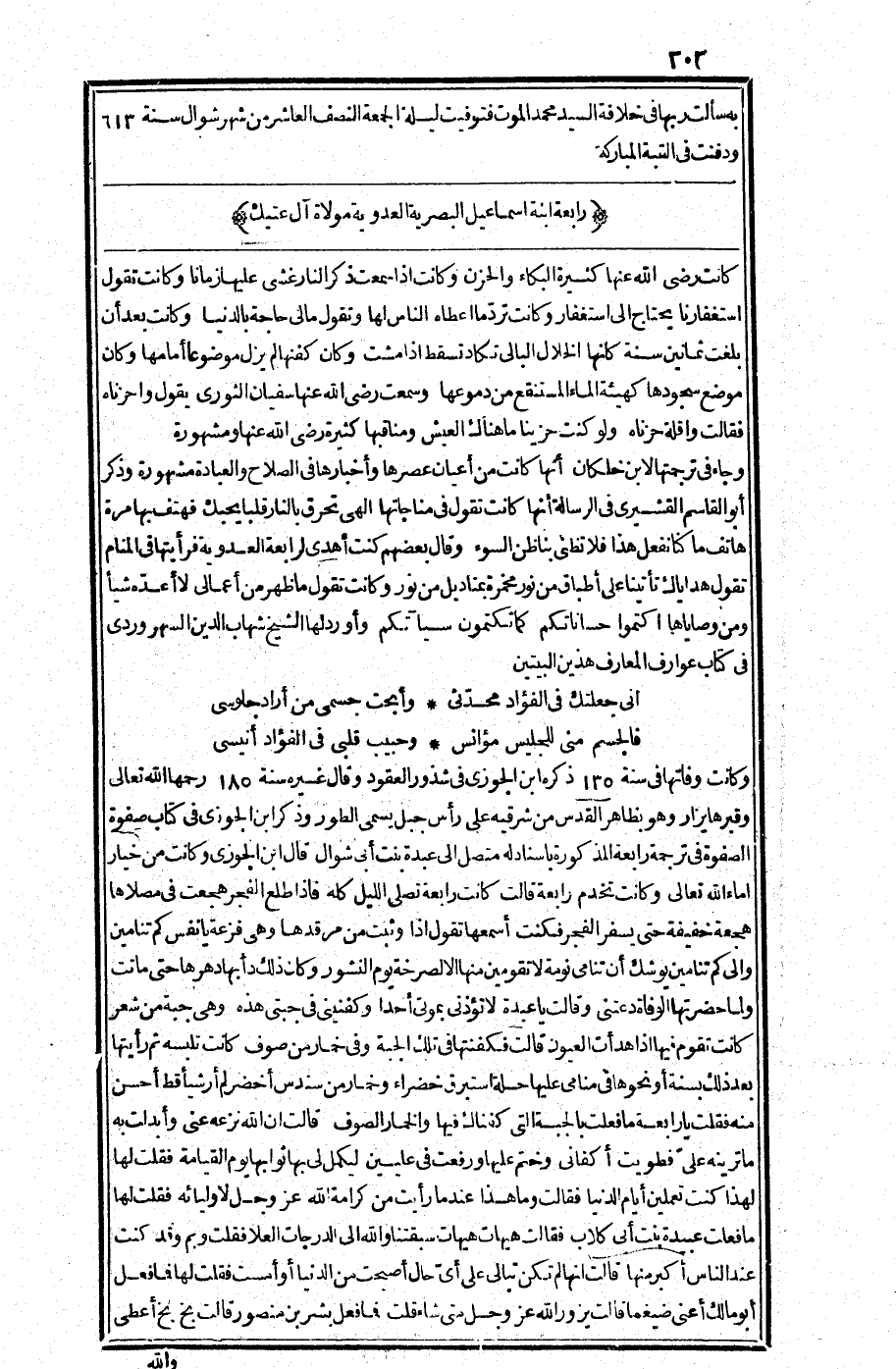 وأورد لها الشيخ شهاب الدين السهروردي في كتاب عوارف المعارف هذين البيتين:
