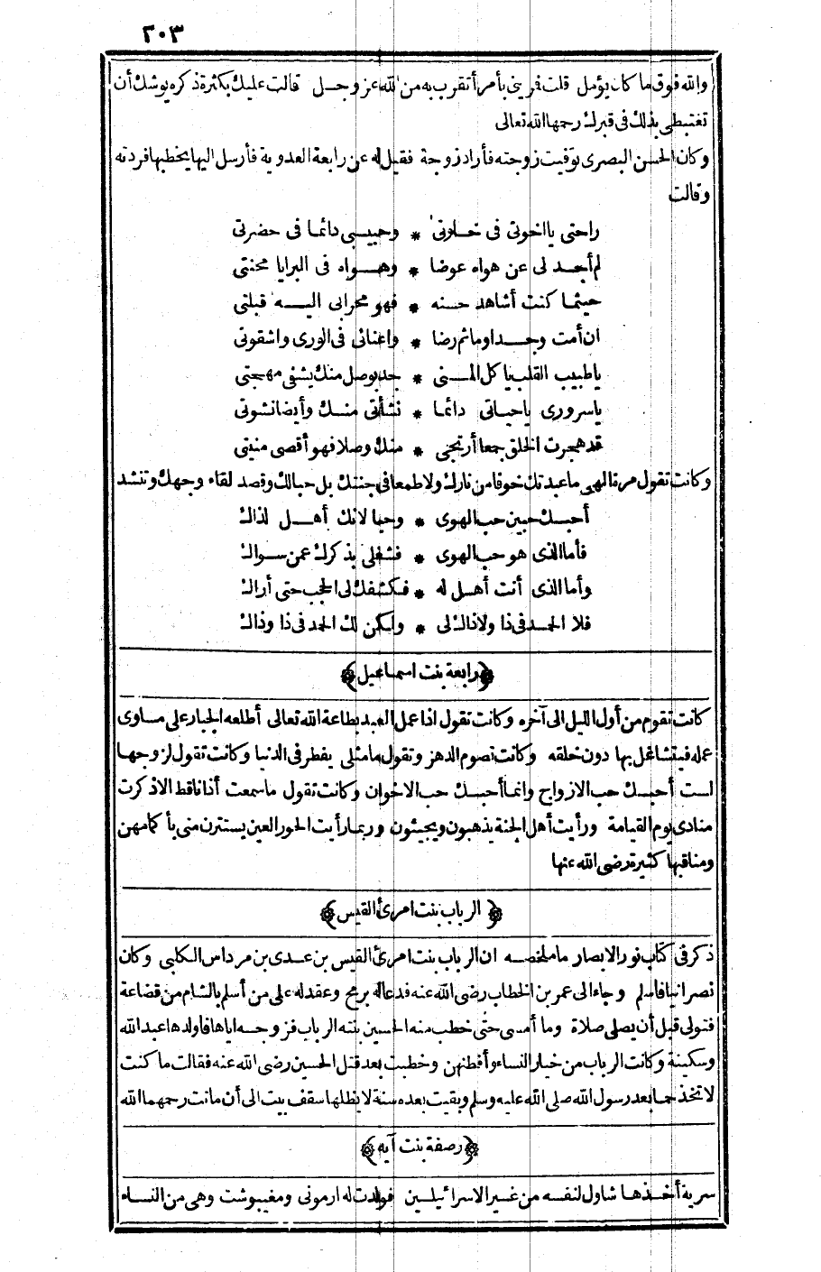 ذكر في كتاب "نور الأبصار" ما ملخصه: إن الرباب بنت امرئ القيس بن عدي بن مرداس الكلبي، وكان نصرانيا فأسلم وجاء إلى عمر بن الخطاب -رضي الله عنه- فدعا له برمح وعقد له على من أسلم بالشام من قضاعة فتولى قبل أن يصلي صلاة، وما أمسى حتى خطب منه الحسين بنته الرباب فزوجه إياها فأولدها عبد الله وسكينة وكانت الرباب من خيار النساء وأفطنهن، وخطبت بعد قتل الحسين -رضي الله عنه- فقالت: ما كنت لأتخذ حما بعد رسول الله صلى الله عليه وسلم. وبقيت بعده سنة لا يظلها سقف بيت إلى أن ماتت رحمها الله.