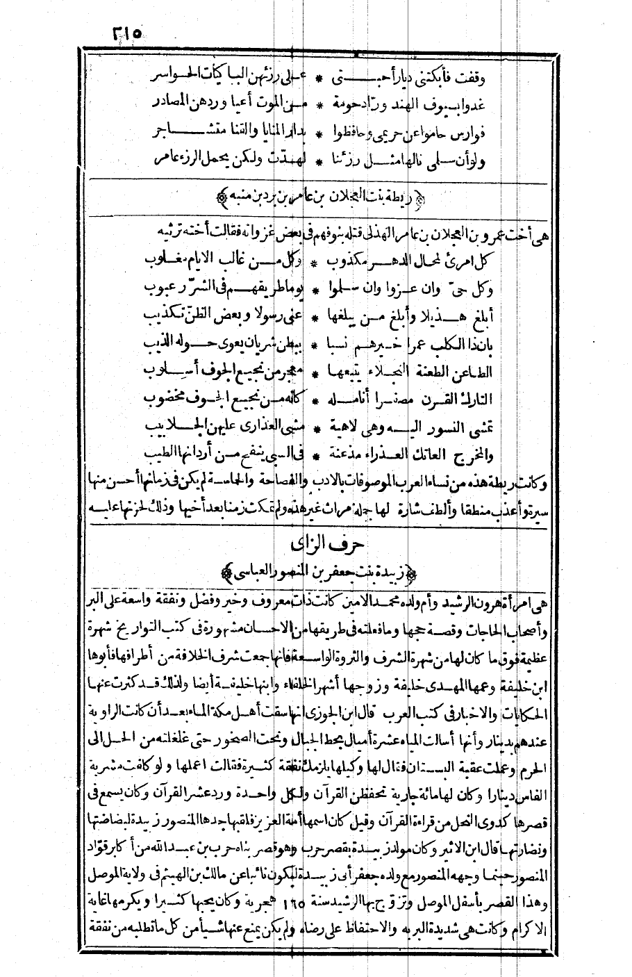 هي امرأة هارون الرشيد وأم ولده محمد الأمين· كانت ذات معروف وخير وفضل ونفقة واسعة على البر وأصحاب الحاجات وقصة حجها وما فعلته في طريقها من الإحسان مشهورة في كتب التواريخ شهرة عظيمة فوق ما كان لها من شهرة الشرف والثروة الواسعة فإنها جمعت شرف الخلافة من أطرافها فأبوها ابن خليفة، وعمها المهدي خليفة، وزوجها أشهر الخلفاء وابنها خليفة أيضا، ولذلك قد كثرت عنها الحكايات والأخبار في كتب العرب· قال ابن الجوزي: إنها سقت أهل مكة الماء بعد أن كانت الرواية عندهم بدينار، وإنها أسالت المياه عشرة أميال بحط الجبال ونحت الصخور حتى غلغلته من الحل إلى الحرم، وعملت عقبة البستان فقال لها وكيلها: يلزمك نفقة كثيرة· فقالت: اعملها ولو كلفت مشربة الناس دينارا، وكان لها مائة جارية تحفظن القر ولكل واحدة ورد عشر القرآن وكان يسمع في قصرها كدوي النحل من قراءة القرآن· وقيل: كان اسمها أمة العزيز فلقبها جدها المنصور زبيدة لبضاضتها ونضارتها·