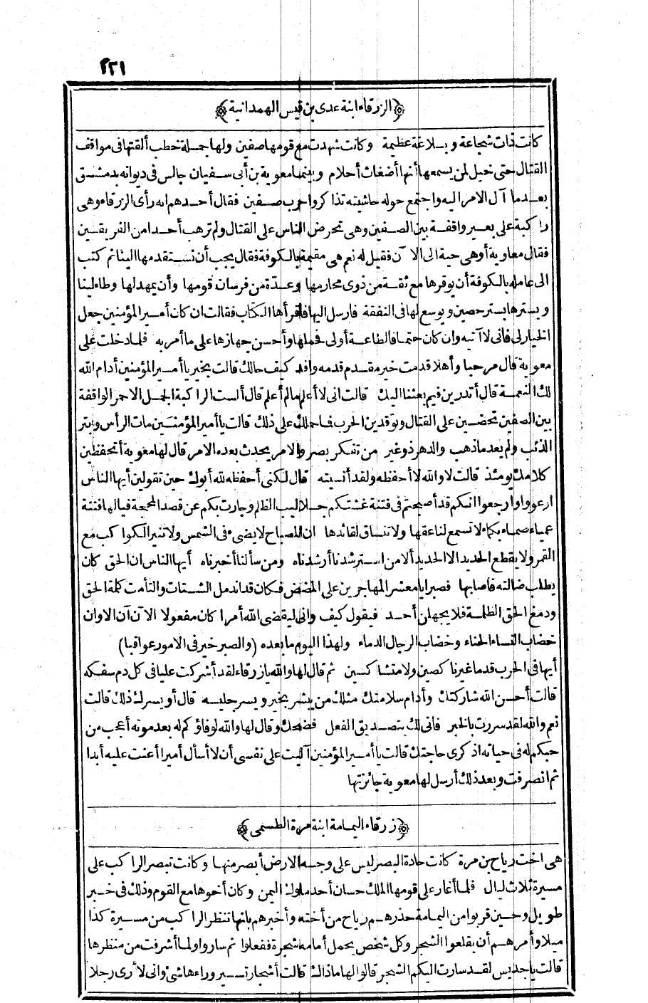 كانت ذات شجاعة وبلاغة عظيمة، وكانت شهدت مع قومها صفين ولها جملة خطب ألقتها في مواقف القتال حتى خيل لمن يسمعها أنها أضغاث أحلام، وبينما معاوية بن أبي سفيان جالس في ديوانه بدمشق بعدما آل الأمر إليه واجتمع حوله حاشيته تذاكروا حرب صفين فقال أحدهم: إنه رأى الزرقاء وهي راكبة على بعير واقفة بين الصفين وهي تحرض الناس على القتال ولم ترهب أحدا من الفريقين· فقال معاوية: أو هي حية إلى الآن؟ فقيل له: نعم، هي مقيمة بالكوفة· فقال: يجب أن نستقدمها إلينا، ثم كتب إلى عامله بالكوفة أن يوقرها مع ثقة من ذوي محارمها وعدة من فرسان قومها، وأن يمهد لها وطاء لينا ويسترها بستر حصين، ويوسع لها في النفقة·فأرسل إليها فأقرأها الكتاب· فقالت: إن كان أمير المؤمنين جعل الخيار لي فإني لا آتيه وإن كان حتما فالطاعة أولى، فحملها وأحسن جهازها على ما أمر به، فلما دخلت علي معاوية قال: مرحبا وأهلا قدمت خير مقدم قدمه وافد، كيف حالك؟ قال: بخير يا أمير المؤمنين أدام الله لم النعمة· قال: أتدرين فيم بعثنا إليك؟ قالت: إني لا أعلم ما أعلم· قال: ألست الراكبة الجمل الأحمر الواقفة بين الصفين تحضين على القتال وتوقدين الحرب فما حملك على ذلك؟ قالت: يا أمير المؤمنين، مات الرأس وبتر الذنب ولم يعد ما ذهب والدهر ذو غير، من تفكر بصر، والأمر يحدث بعده الأمر· قال لها معاوية: أتحفظين كلامك يومئذ؟ قالت: لا والله لا أحفظه ولقد نسيته· قال: لكني أحفظه لله أبوك حين تقولين: زيها الناس ارعووا وارجعوا قد أصبحتم في فتنة غشتكم جلاليب الظلم، وجارت بكم عن قصد المحجة فيا لها فتنة عميا صماء بكماء لا تسمع لناعقها ولا تنساق لقائدها· إن المصباح لا يضيء في الشمس ولا تنير الكواكب مع القمر، ولا يقطع الحديد إلا الحديد ألا من استرشدنا أرشدناه، ومن سألنا أخبرناه، أيها الناس إن الحق كان يطلب ضالته فأصابها فصبرا يا معشر المهاجرين على المضض فكان قد اندمل الشتات والتأمت كلمة الحق ودمغ الحق الظلمة، فلا يجهلن أحد فيقول: كيف وإني ليقضي الله أمرا كان مفعولا، الآن آن الأوان خضاب النساء الحناء وخضاب الرجال الدماء، ولهذا اليوم بعده والصبر خير في الأمور عواقبا· أيها في الحرب قدما غير ناكصين ولا متشاكسين ثم قال لها: والله يا زرقاء لقد أشركت عليا في كل دم سفكه· قالت: أحسن الله شاركتك وأدام سلامتك مثلك من يبشر بخير ويسر جليسه قال: أو يسرك ذلك؟ قالت: نعم والله سررت بالخبر فإني لك بتصديق الفعل، فضحك وقال لها: والله لوفاؤكم له بعد موته أعجب من حبكم له في حياته اذكري حاجتك· قالت: يا أمير المؤمنين آليت على نفسي أن لا أسأل أميرا أعنت عليه أبدا· ثم انصرفت وبعد ذلك أرسل لها معاوية جائزتها·