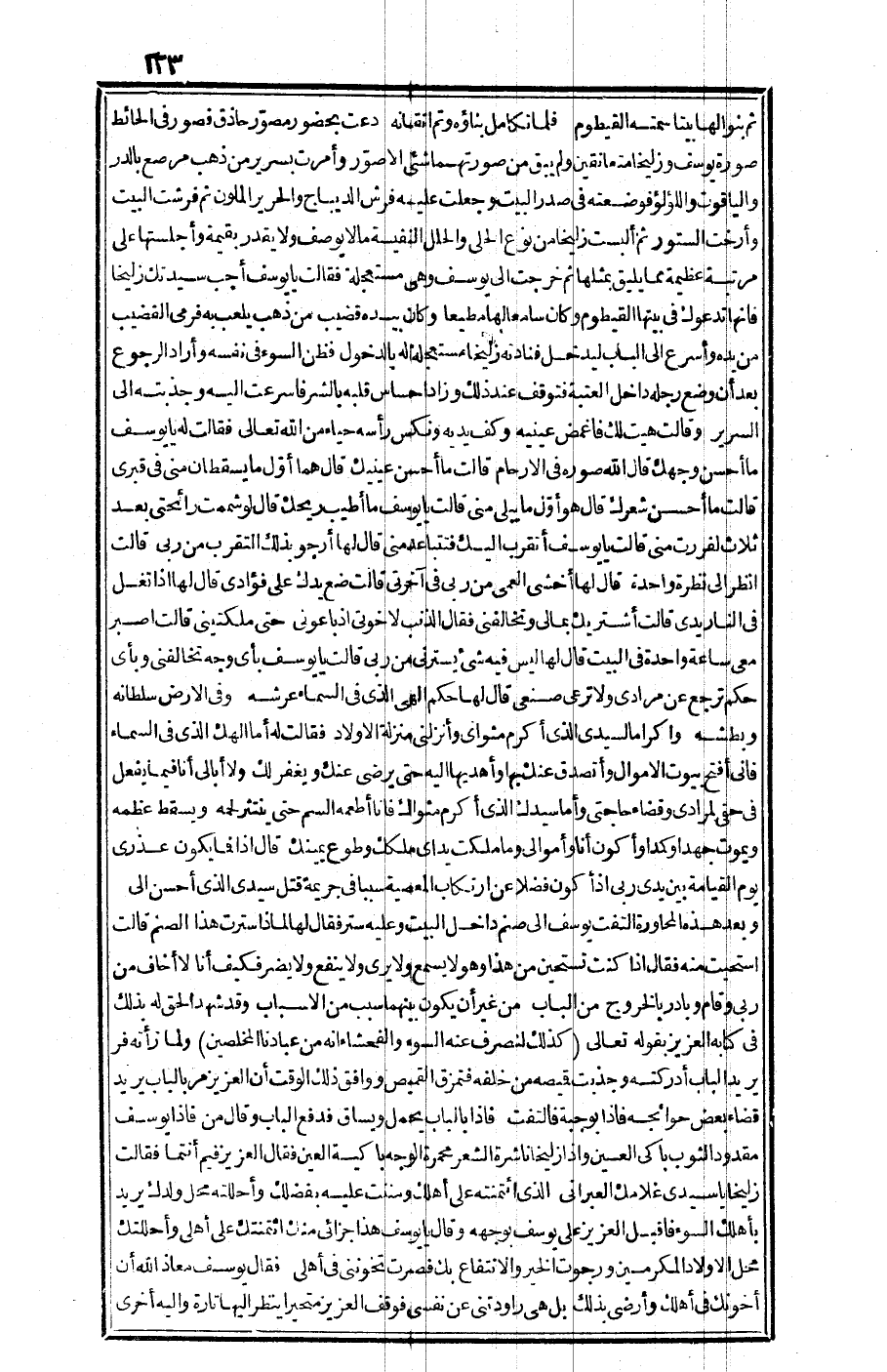 ثم خرجت إلى يوسف وهي مستعجلة فقالت: يا يوسف أجب سيدتك زليخا فإنها تدعوك في بيتها القيطوم وكان سامعاً لها مطيعاً، وكان بيده قضيب من ذهب يلعب به، فرمى القضيب من يده وأسرع إلى الباب ليدخل فنادته زليخا مستعجلة له بالدخول فظن السوء في نفسه وأراد الرجوع بعد أن وضع رجله داخل العتبة، فتوقف عند ذلك وزاد إحساس قلبه بالشر فأسرعت إليه وجذبته إلى السرير وقالت: هيت لك، فأغمض عينيه وكف يديه ونكس رأسه حياء من الله تعالى فقالت له: يا يوسف، ما أحسن وجهك· قال: الله صوره في الأرحام· قالت: ما أحسن عينيك! قال: هما أول ما يسقطان مني في قبري· قالت: ما أحسن شعرك! قال: هو أول ما يبلى مني· قالت: يا يوسف: ما أطيب ريحك! قال: لو شممت رائحتي بعد ثلاث لفررت مني، قالت: يا يوسف أتقرب إليك فتتباعد مني! قال لها: أرجو بذلك التقرب من ربي· قالت: انظر إلي نظرة واحدة· قال لها: أخشى العمى من ربي في آخرتي· قالت: ضع يدك على فؤادي· قال لها: إذا تغل في النار يدي· قالت: أشتريك بمالي وتخالفني· فقال: الذنب لإخوتي إذ باعوني حتى ملكتيني· قالت: اصبر معي ساعة واحدة في البيت· قال لها: ليس فيه شيء يسترني من ربي قالت: يا يوسف، بأي وجه تخالفني وبأي حكم ترجع عن مرادي ولا ترعى صنعي؟ قال لها: حكم إلهي الذي في السماء عرشه، وفي الأرض سلطانه وبطشه وإكراماً لسيدي الذي أكرم مثواي وأنزلني منزلة الأولاد· فقالت له: أما إلهك الذي في السماء فإني أفتح بيوت الأموال وأتصدق عنك بها وأهديها إليه حتى يرضى عنك ويغفر لك، ولا أبالي أنا فيما يفعل في حقي لمرادي وقضاء حاجتي، وأما سيدك الذي أكرم مثواك فأنا أطعمه السم حتى ينتثر لحمه ويسقط عظمه ويموت جهداً وكمداً، وأكون أنا وأموالي وما ملكت يداي ملكك وطوع يمينك· قال: إذاً فما يكون عذري يوم القيامة بين يدي ربي إذ أكون فضلاً عن ارتكاب المعصية سبباً في جريمة قتل سيدي الذي أحسن إلي. وبعد هذه المحاورة التفت يوسف إلى صنم داخل البيت وعليه ستر فقال لها: لماذا سترت هذا الصنم؟ قالت: استحيت منه، فقال: إذا كنت تستحين من هذا وهو لا يسمع ولا يدري ولا ينفع ولا يضر فكيف أنا لا أخاف من ربي وقام وبادر بالخروج من الباب من غير أن يكون بينهما سبب من الأسباب وقد شهد الحق له بذلك في كتابه العزيز بقوله تعالى (كذلك لنصرف عنه السوء والفحشاء إنه من عبادنا المخلصين) (يوسف: 24) .