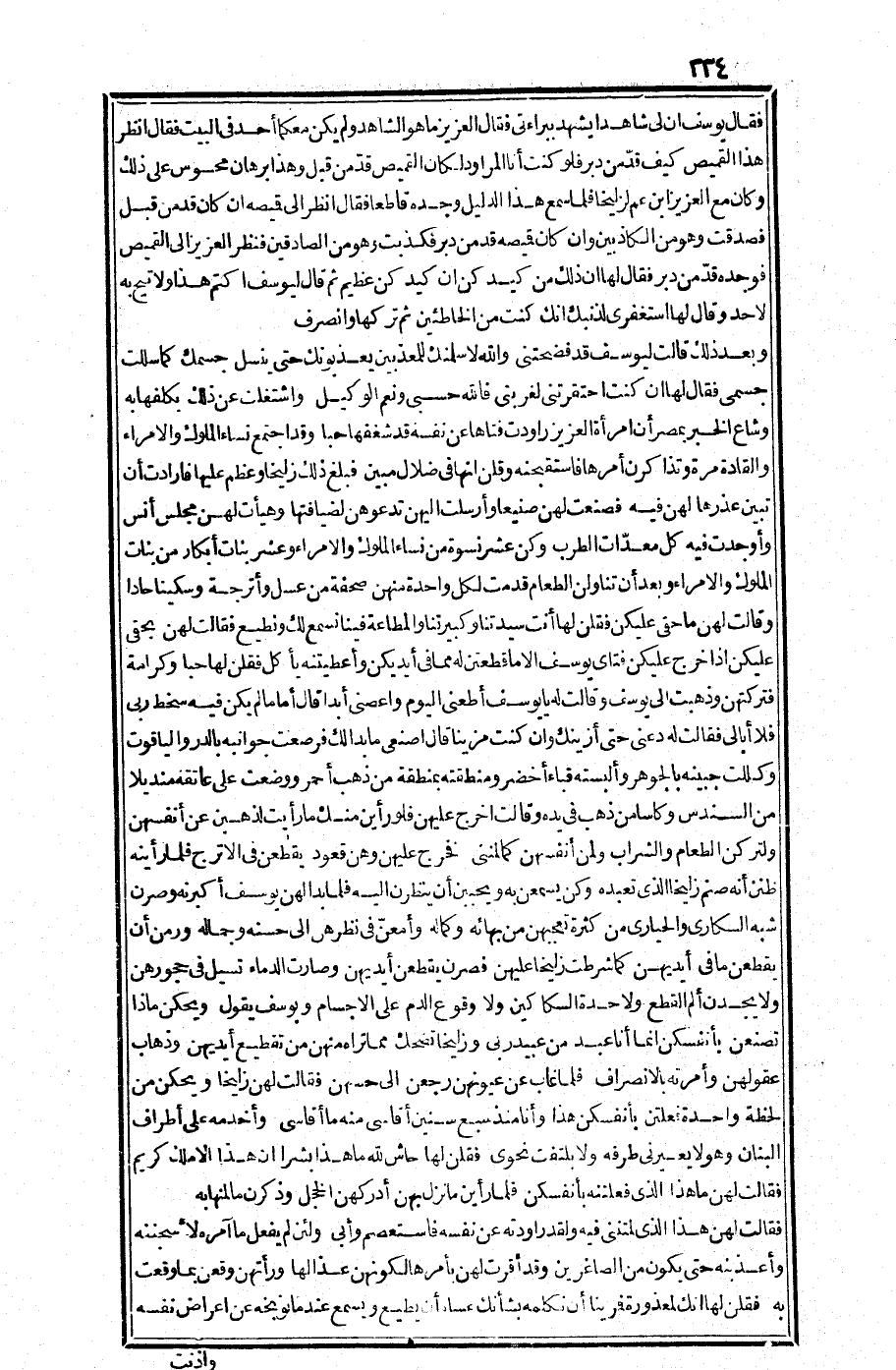 وبعد ذلك قالت ليوسف: قد فضحتني والله لأسلمنك للمعذبين يعذبونك حتى ينسل جسمك كما سللت جسمي· فقال لها: إن كنت احتقرتني لغربتي فالله حسبي ونعم الوكيل· واشتغلت عن ذلك بكلفها به وشاع الخبر بمصر أن امرأة العزيز راودت فتاها عن نفسه قد شغفها حباً، وقد اجتمع نساء الملوك والأمراء والقادة مرة وتذاكران أمرها قاستقبحنه وقلن: إنها في ضلال مبين، فبلغ ذلك زليخا وعظم عليها فأرادت أن تبين عذرها لهن فيه فصنعت لهن صنيعاً وأرسلت إليهن تدعوهن لضيافتها، وهيأت لهن مجلس أنس وأوجدت فيه كل معدات الطرب وكن عشرة نسوة من نساء الملوك والأمراء وعشر بنات أبكار من بنات الملوك والأمراء، وبعد أن تناولن الطعام قدمت لكل واحدة منهن صحفة من عسل وأترجة وسكيناً حاداً، وقالت لهن: ما حقي عليكن؟ فقلن لها: أنت سيدتنا وكبيرتنا والمطاعة فينا نسمع لك ونطيع· فقالت: لهن: بحقي عليكن إذا خرج عليكن فتاي يوسف إلا ما قطعتن له مما في أيديكن وأعطيتنه يأكل· فقلن لها حباً وكرامة· فتركتهن وذهبت إلى يوسف وقالت له: يا يوسف، أطعني اليوم واعصني أبداً· قال: أما مالم يكن فيه سخط ربي فلا أبالي · فقالت له: دعني حتى أزينك وإن كنت مزيناً قال: اصنعي ما بدا لك، فرصعت جوانبه بالدر والياقوت وكللت جبينه بالجوهر وألبسته قباء أخطر ومنطقته بمنطقة من ذهب أحمر، ووضعت على عاتقه منديلاً من السندس وكأساً من ذهب في يده وقالت: اخرج عليهن فلو رأين منك ما رأيت لذهبن عن أنفسهن ولتركن الطعام والشراب ولمن أنفسهم كما لمنني· فخرج عليهن وهن قعود يقطعن في الأترج فلما رأينه ظنن أن صنم زليخا الذي تعبده وكن يسمعن به ويحببن أن ينظرن إليه، فلما بدا لهن يوسف أكبرنه وصرن شبه السكارى والحيارى من كثرة تعجبهن من بهائه وكماله وأمعن في نظرهن إلى حسنه وجماله ورمن أن يقطعن ما في أيديهن كما شرطت زليخا عليهن فصرن يقطعن أيديهن وصارت الدماء تسيل في حجورهن ولا يجدن ألم القطع ولا حدة السكاكين ولا وقوع الدم على الأجسام، ويوسف يقول: ويحكن ماذا تصنعن بأنفسكن إنما أنا عبد من عبيد ربي، وزليخا تضحك مما تراه منهن من تقطيع أيديهن وذهاب عقولهن وأمرته بالانصراف، فلما غاب عن عيونهن رجعن إلى حسهن فقالت لهن زليخا: ويحكن من لحظة واحدة فعلتن بأنفسكن هذا وأنا منذ سبع سنين أقاسي منه ما أقاسي، وأخدمه على أطراف البنان وهو لا يعيرني طرفه ولا يلتفت نحوي فقلن لها: حاشى لله ما هذا بشراً أن هذا إلا ملك كريم فقالت لهن: ما هذا الذي فعلتنه بأنفسكن؟ فلما رأين ما نزل بهن أدركهن الخجل وذكرن ما لمنها به· فقالت لهن: هذا الذي لمتنني فيه ولقد راودته عن نفسه فاستعصم وأبى ولئن لم يفعل ما آمره لأسجننه وأعذبنه حتى يكون من الصاغرين· وقد أقرت لهن بأمرها لكونهن عذالها ورأتهن وقعن بما وقعت به فقلن لها: إنك لمعذورة فمرينا أن نكلمه بشأنك عساه أن يطيع ويسمع عندما توبخه عن إعراض نفسه