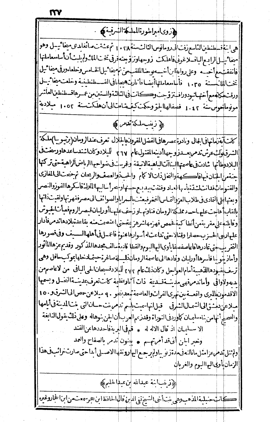 كانت آية زمانها في الجمال ونادرة عصرها في الفضل المقرون بالجلال تعرف عند الرومان ب زنوبيا ملكة الشرق، تولت عرش تدمر بعد زوجها أذينه المقتول عام 267 للميلاد وكان أشتد ساعدها ورسخت في البلاد وطأتها في عاصمتها البناءات الباهية الأنيقة، وغرست في ضراحيها الرياض الزاهية حتى تركتها جنة من الجنان فيها فاكهة، والنخل ذات الأكمام، والحب ذو العصف والريحان· ثم جنحت إلى المغازي والفتوحات ودانت لشدة بأسها العباد، وفتنت ببديع حسنها وسحر أساليبها الملوك، فأسكرها الفوز والنصر وبعثها على التمادي في طلاب العز والتماس الفخر فبعثت بالسرايا والصوائف إلى مصر فقهرتها ولقبت ذاتها بألقاب أهاجت عليها حسد مملكة الرومان، فنوتها وزحف عليها أورليان قيصر روم، فعبأت الجيوش وقابلته على مقربة من أنطاكية فحمص، فهزمها شر هزيمة حتى اعتصمت منه بقاعدة بلادها تدمر، فأدار عليها رحى الحرب حصاراً وقتالاً حتى تداعت له أسوارها عنوة فأعمل في أهلها السيف، وفي قصورها التخريب حتى غادرها قاعا صفصفاً يأوي إليها البوم والقطا، نادبة سالف مجدها المذكور، وقديم عزمها المأثور·
