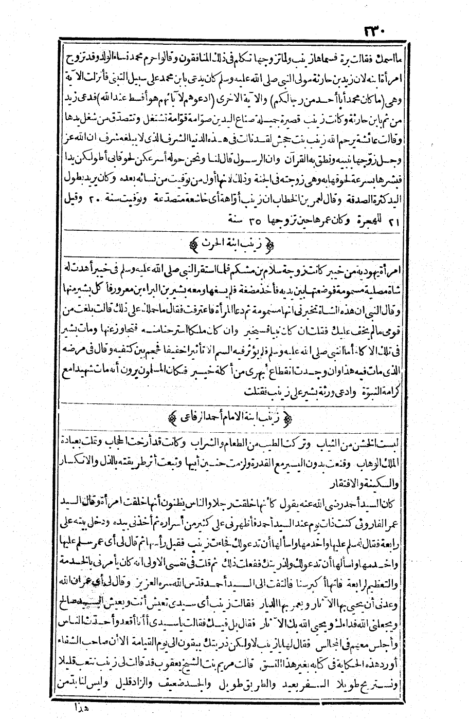 ما اسمك؟ "· فقالت: برة، فسماها زينب ولما تزوجها تكلم في ذلك المنافقون وقالوا: حرم محمد نساء الولد وقد تزوج امرأة ابنه لأن زيد بن حارثة مولى النبي صلى الله عليه وسلم كان يدعى بابن محمد على سبيل التبني فأنزلت الآية وهي: (ما كان محمد أبا أحد من رجالكم) (الأحزاب: 04) والآية الأخرى (ادعوهم لآبائهم هو أقسط عند الله) (الأحزاب: 5) · فدعي زيد من ثم بابن حارثة، وكانت زينب قصيرة جميلة، صناع اليدين، صوامة، قوامة، تشتغل وتتصدق من شغل يدها· وقالت عائشة: يرحم الله زينب بنت حجش لقد نالت في هذه الدنيا الشرف الذي لا يبلغه شرف، إن الله عز وجل زوجها بنيه ونطق القرآن وإن الرسول قال لنا ونحن حوله: "أسرعكن لحوقاً بي أطولكن يداً" فبشرها بسرعة لحوقها به وهي زوجته في الجنة وذلك لأنها أول من توفيت من نسائه بعده، وكان يريد بطول اليد كثرة الصدقة· وقال لعمر بن الخطاب: "إن زينب أواهة" أي خاشعة متصدعة· وتوفيت سنة 02 · وقيل: 12 للهجرة وكان عمرها حين تزوجها 53 سنة·