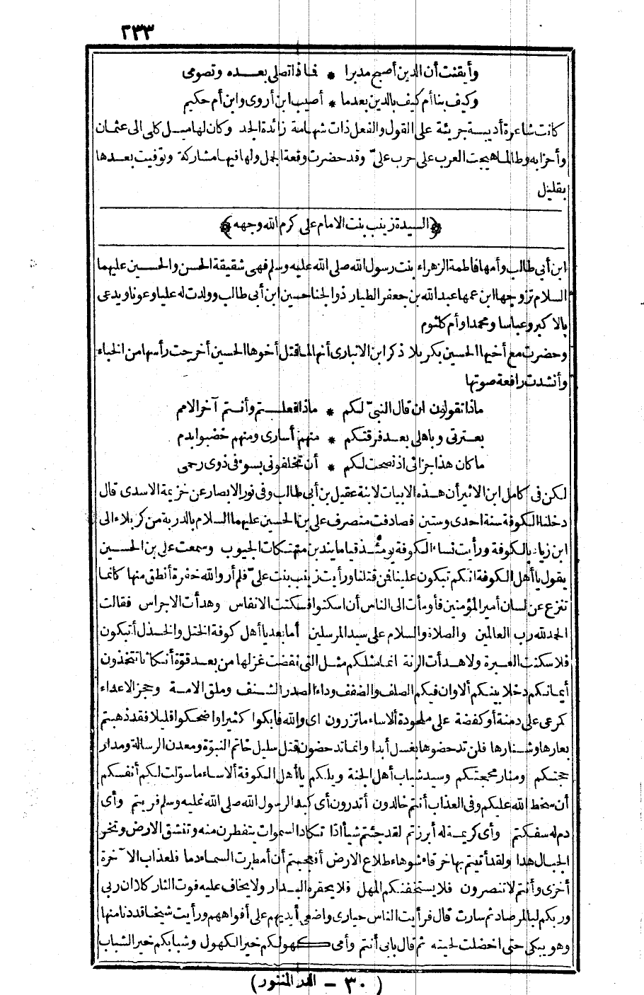 السيدة زينب بنت الإمام علي - كرم الله وجهه - بن أبي طالب وأمها فاطمة الزهراء بنت رسول الله صلى الله عليه وسلم فهي شقيقة الحسن والحسين عليهما السلام· تزوجها ابن عمها عبد الله بن جعفر الطيار ذو الجناحين ابن أبي طالب وولدت له علياً وعوناً ويدعى بالأكبر وعباساً، ومحمداً وأم كلثوم· وحضرت مع أخيها الحسين بكربلاء· ذكر ابن الأنباري: أنها لما قتل أخوها الحسين أخرجت رأسها من الخباء وأنشدت رافعة صوتها: ماذا تقولون إن قال النبي لكم=ماذا فعلتم وأنتم آخر الأمم بعترتي وبأهلي بعد فرقتكم=منهم أسارى ومنهم خضبوا بدم ما كان هذا جزائي إذ نصحت لكم=أن تخلفوني بسوء في ذوي رحمي لكن في "كامل ابن الأثير": أن هذه الأبيات لابنة عقيل بن أبي طالب· وفي "نور الأبصار" عن خزيمة الأسدي قال: دخلنا الكوفة سنة إحدى وستين فصادفت منصرف علي بن الحسين -عليهما السلام- بالدربة من كربلاء إلى ابن زياد بالكوفة ورأيت نساء الكوفة يومئذ قياما يندبن متهتكات الجيوب، وسمعت علي بن الحسين يقول: يا أهل الكوفة، إنكم تبكون علينا فمن قتلنا ورأيت زينب بنت علي فلم أر والله خفرة أنطق منها كأنما تنزع عن لسان أمير المؤمنين فأومأت إلى الناس أن اسكتوا فسكتت الأنفاس، وهدأت الأجراس فقالت: "الحمد الله رب العالمين، والصلاة والسلام على سيد المرسلين. أما بعد، يا أهل كوفة الختل والخذل أتبكون فلا سكنت العبرة ولا هدأت الرنة، إنما مثلكم مثل التي نقضت غزلها من بعد قوة أنكاثا تتخذون أيمانكم دخلا بينكم، ألا وإن فيكم الصلف والضعف وداء الصدر الشنف، وملق الأمة، وحجز الأعداء كمرعي على دمنة، أو كفضة على ملحودة أل ساء ما تزرون أي والله تدحضون قتل سلسل خاتم النبوة ومعدن الرسالة ومدار حجتكم، ومنار محجتكم، وسيد شباب أهل الجنة ويلكم يا أهل الكوفة ألا ساء ما سولت لكم أنفسكم أ، سخط الله عليكم وفي العذاب أنتم خالدون، أتدرون أي كبد لرسول الله صلى الله عليه وسلم فريتم، وأي دم له سفكتم، وأي كريمة له أبرزتم لقد جئتم شيئا إذا تكاد السموات يتفطرن منه وتنشق الارض وتخر الجبال هدا، ولقد أتيتم بها خرقاء شوهاء طلاع الأرض. أفعجبتم إن أمرطت السماء دما فلعذاب الآخرة أخزى، وأنتم لا تنصرون. فلا يستخفنكم المهل، فلا يحقره البدار، ولا يخفا عليه فوت الثأر، كلا إن ربي وربكم لبالمرصاد". ثم سارت، قال: فرأيت الناس حيارى واضعي أيديهم على أفواهمم ورأيت شيخا قد دنا منها وهو يبكي حتى اخضلت لحيته، ثم قال: بأبي أنتم وأمي كهولهم خير الكهول وشبابكم خير الشباب