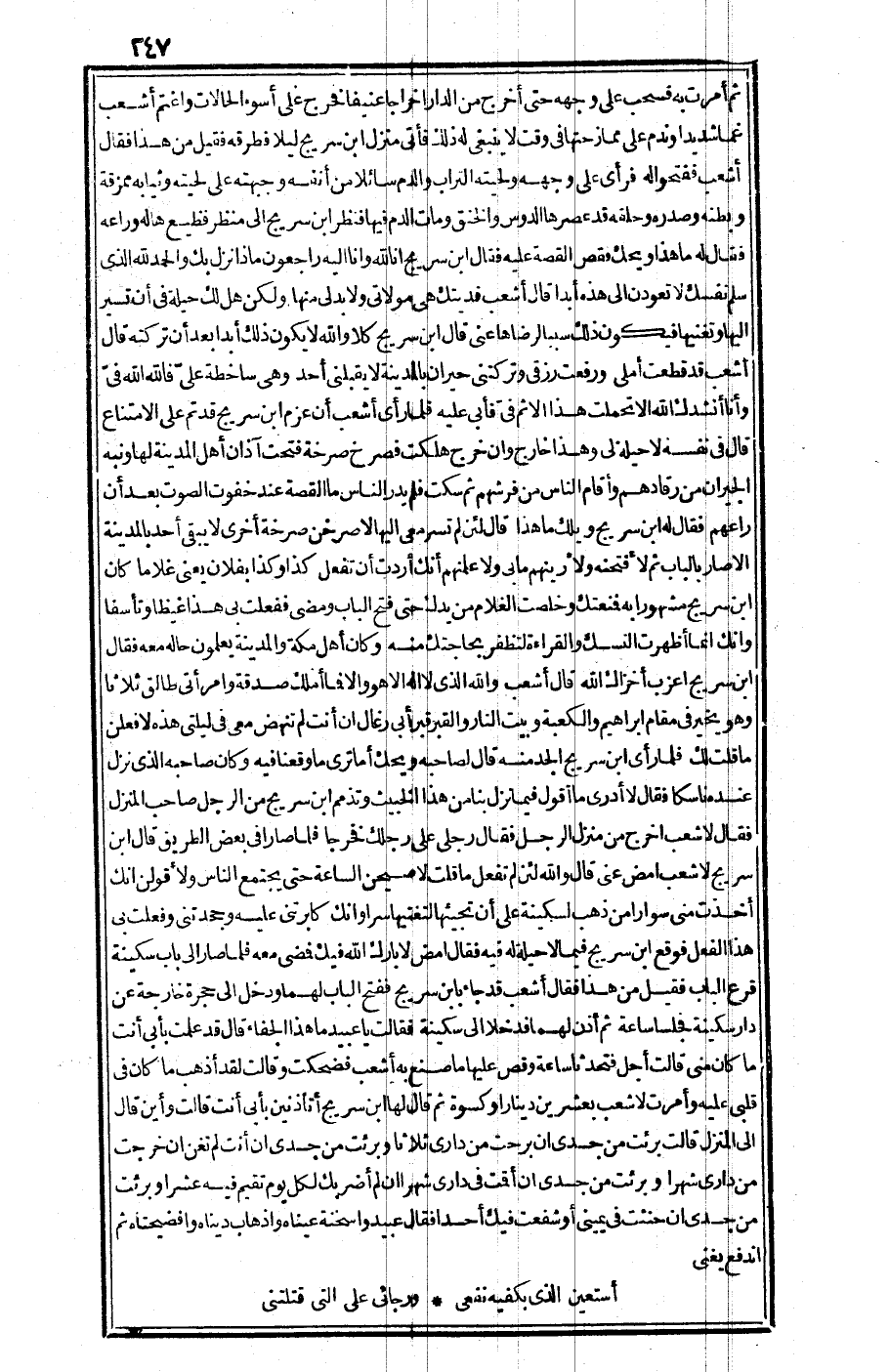 قال أشعب: فديتك هي مولاتي ولابد لي منها، ولكن هل لك حيلة في أن تسير إليها وتغنيها فيكون ذلك سببا لرضاها عني؟ قال ابن سريج: كلا والله لا يكون ذلك أبدا بعد أن تركته. قال أشعب: قد قطعت أملي ورفعت رزقي وتركتني حيران بالمدينة لا يقبلني أحد، وهي ساخطة علي، فالله الله في وأنا أنشدك الله ألا تحملت هذا الإثم في. فأبى عليه. فلما رأى أشعب أن عزم ابن سريج قد تم على الامتناع قال في نفسه: لا حيلة لي وهذا خارج وإن خرج هلكت، فصرخ صرخة، فتحت آذان أهل المدينة لها ونبه الجيران من رقادهم وأقام النسا من فرشهم، ثم سكت فلم يدر الناس ما القصة عند خفوت الصوت بعد أن راعهم. فقال له ابن سريج: ويلط ما هذا؟ قال: لئن لم تسر معي إليه الأصرخن صرخة أخرى لا يبقى أحد بالمدينة إلا صار بالباب، ثم لأفتحنه ولرينهم ما بي ولأعلمنهم انك أردت أن تفعل كذا وكذا بفلان - يعني غلاما كان ابن سريج مشهورا به - فمنعتك وخلصت الغلام من يدك حتى فتح الباب ومضى ففعلت بي هذا غيظا وتأسفا وأنك إنما أظهرت النسك والقراءة لتظفر بحاجتك منه وكان أهل مكة والمدينة يعلمون حاله معه فقال ابن سريج: أعزب - أخزاك الله.